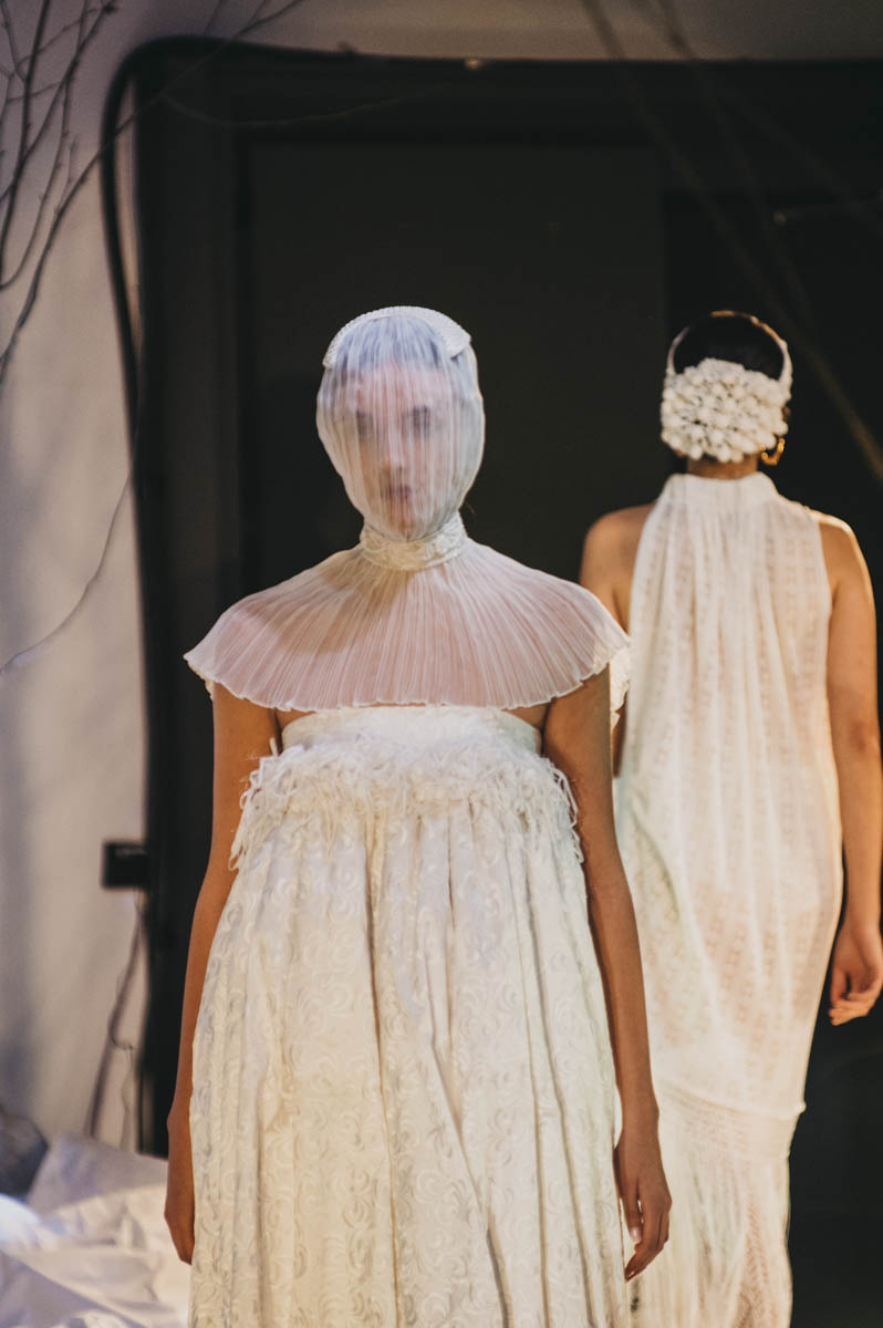 Durante este año de residencia, Nuria de Oliveira está trabajando, entre otras cosas, el mundo nupcial inspirado en Carmen Amaya. Con novias originales y diferentes que mezclan arte y moda o a la inversa. Lo que más llama la atención son los tejidos utilizados en las prendas, ya que descontextualiza el uso que se les da a estos materiales en un mundo tan sobrio como es el de la moda nupcial.
