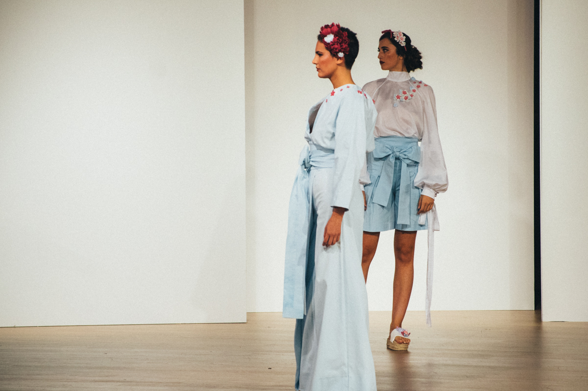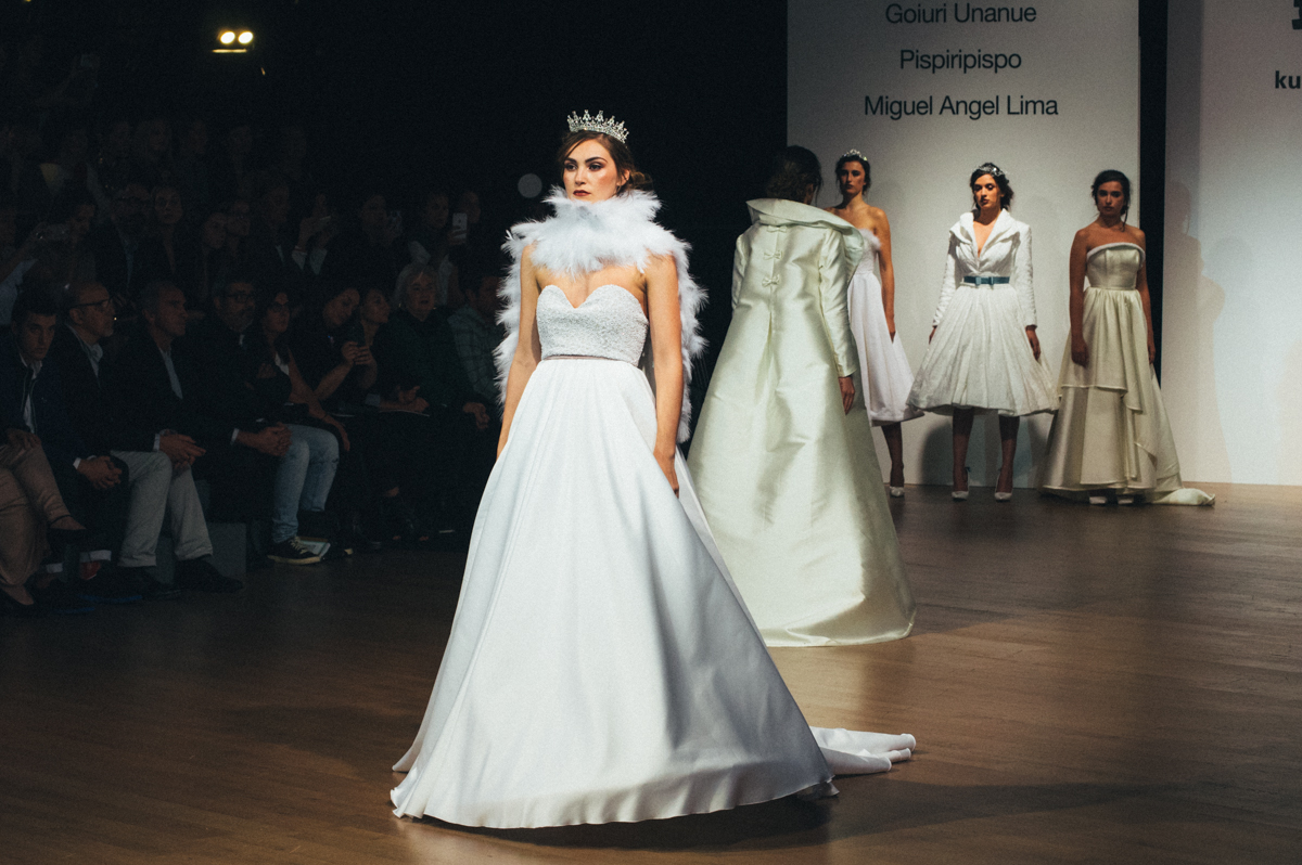 Me sorprendieron agradablemente los diseños de Saioa Matxain. Tejidos de lino y algodón en azul cielo, blanco y tonos malva y rosa. Original su interpretación del kimono y las faldas pantalón para favorecer la libertad de movimientos. Julen Linde presentó 6 diseños todos ellos masculinos. Formas rígidas, estructuradas y tono apagados en una colección inspirada por una sociedad discriminadora. El cierre fue para Inge Zubeldia y su colección nupcial con novias que bien podían haber salido del cuento La Reina de las Nieves.