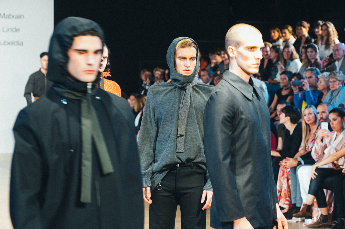 El viernes fue el turno para los 6 diseñadores residentes en el espacio que Kutxa Kultur tiene en Tabakalera. Goiuri Unanue presentó 8 diseños donde pudimos ver conjuntos de dos piezas con falda y pantalón en tonos granates, rosa y verde. Me encantó el toque de la boina para dar estilo francés a lo looks. Pispiripispo con su línea de ropa infantil, cómoda, de líneas rectas y estampados originales sacó la sonrisa de todos los presentes. Miguel Angel Lima mostró la propuesta arriesgada de la noche; un manifiesto de emociones entre el dolor y el placer. El vestido gris de su colección es uno de mis favoritos.