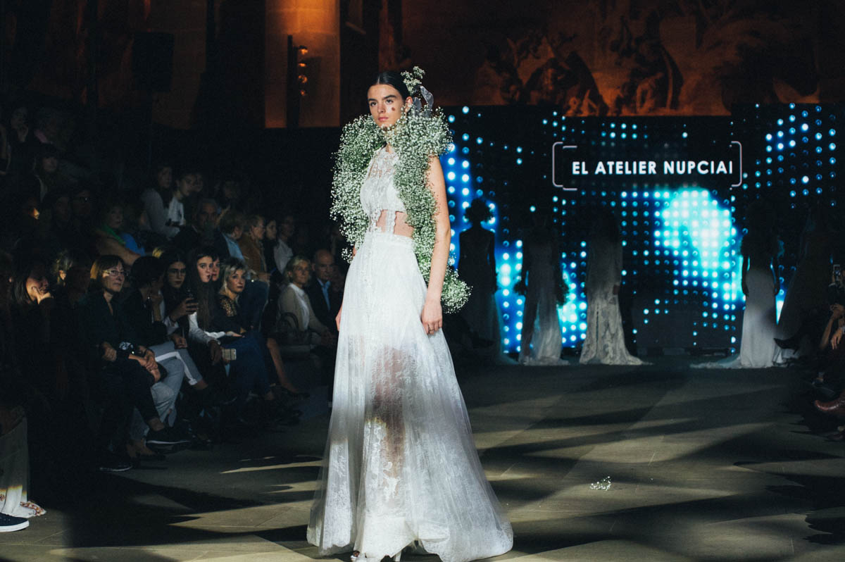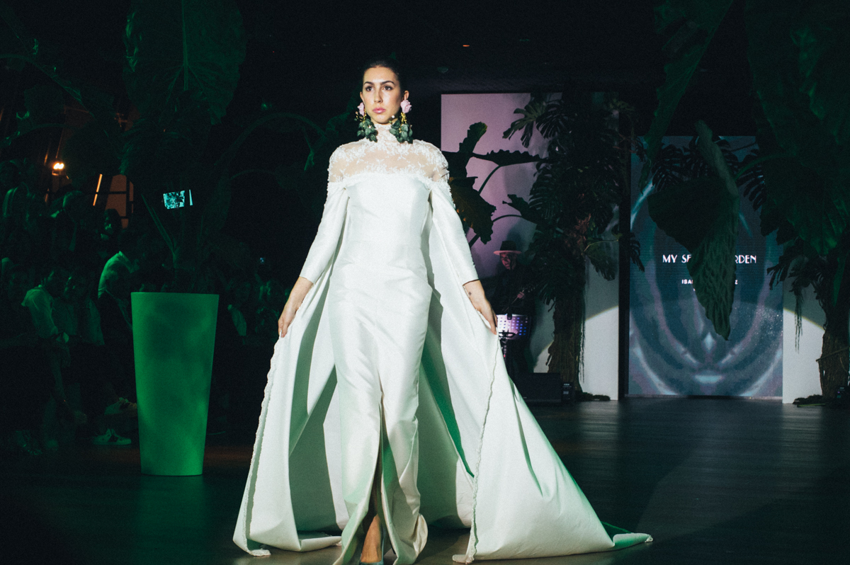 No podían faltar los vestidos de novia, marca de la casa, de gran belleza y elegancia. También hay que destacar los diseños que cerraron en su día su primer desfile en la pasarela Cibeles Novias, la desaparecida Gaudí, o su primera vez en la pasarela de Nueva York. No podía faltar el vestido con el que cerró la noche; un clásico de novia con escote barco, manga francesa y gran cola, inspirado, como no podía ser de otra manera, en Balenciaga.