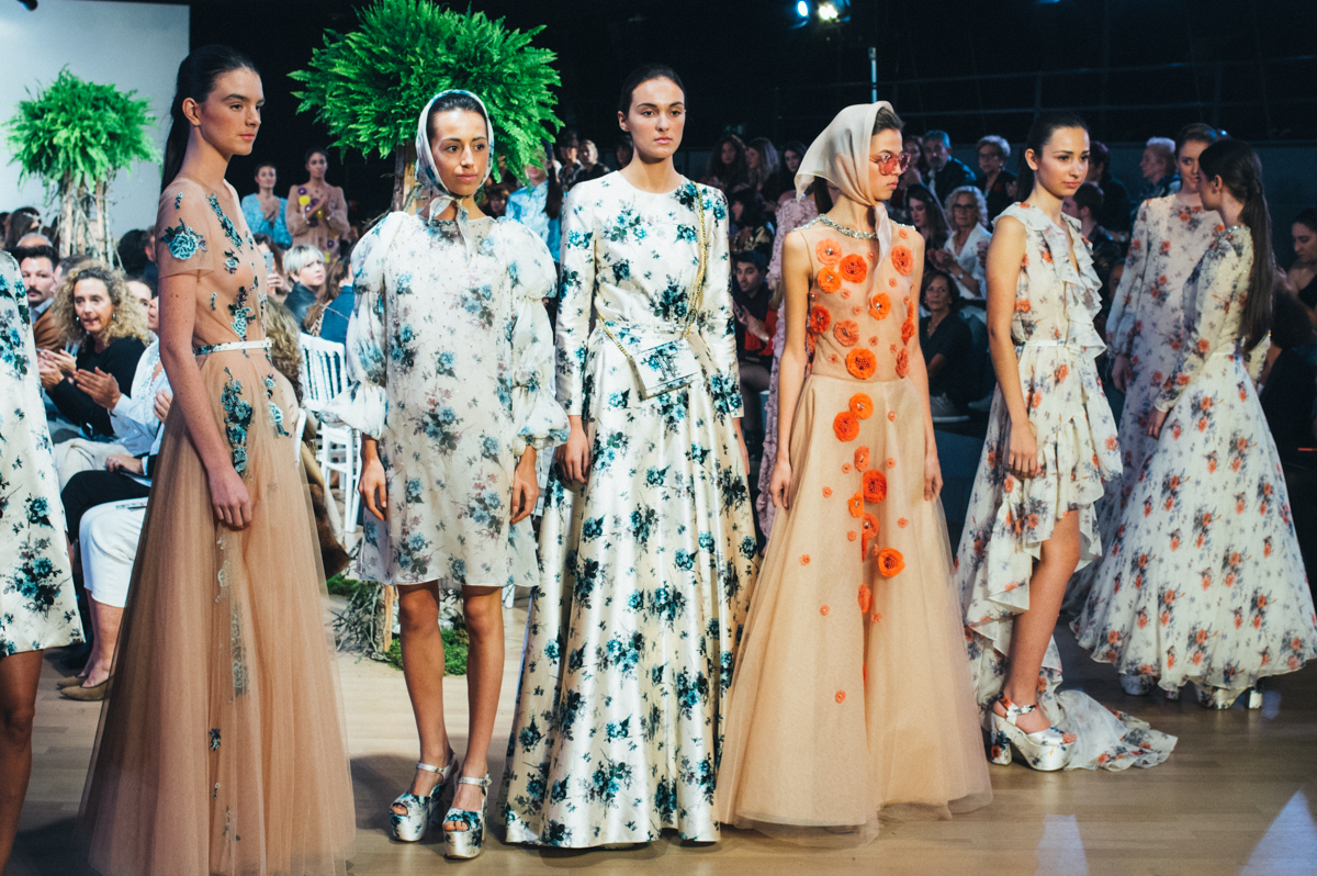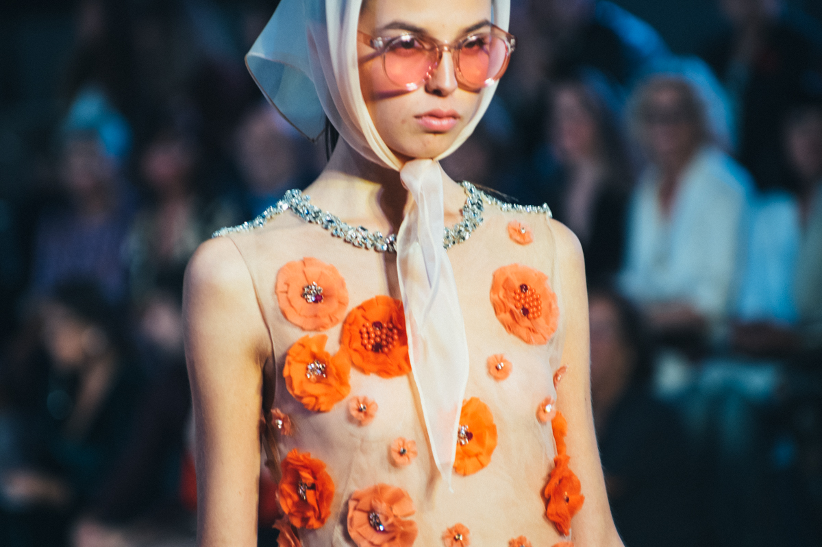 En los bellísimos diseños que pudimos disfrutar hay que destacar los bordados primaverales en 3D, las aplicaciones de cristal y paillettes en tonos mostaza, púrpura y naranja y los bucólicos estampados de flores. Los accesorios son parte importante de la colección. Gafas de sol XL, pañuelos en la cabeza al más puro estilo Grace Kelly y sombreros de inspiración Audrey Hepburn. Zapatos de estilo retro y altísimas plataformas se alternan con sandalias biker en print floral con tiras y hebillas. Cerrando los looks una exclusiva colección de carteras-joyas inspiradas en el Art Déco con herrajes de orfebrería y las iniciales del diseñador hechos en piedras semipreciosas y madera.