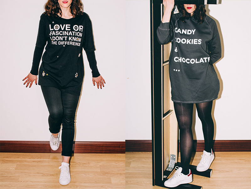 Así que este otoño-invierno mi look básico, mi uniforme casi diario va a ser amplio, sin marcar la silueta pero sobre todo, cómodo, muy cómodo. Eso sí, sin dejar de ser femenina. Que una, aunque a veces no lo parezca, tiene su punto presumido. Así que vestidos camiseros con pitillo y botín, vestidos sudadera con medias y bota motera o zapatillas, camisetas amplias con faldas midi marcando cintura o con un vaquero ceñido o un total black roto con unas zapatillas blancas. Mil y una combinaciones para cada día.