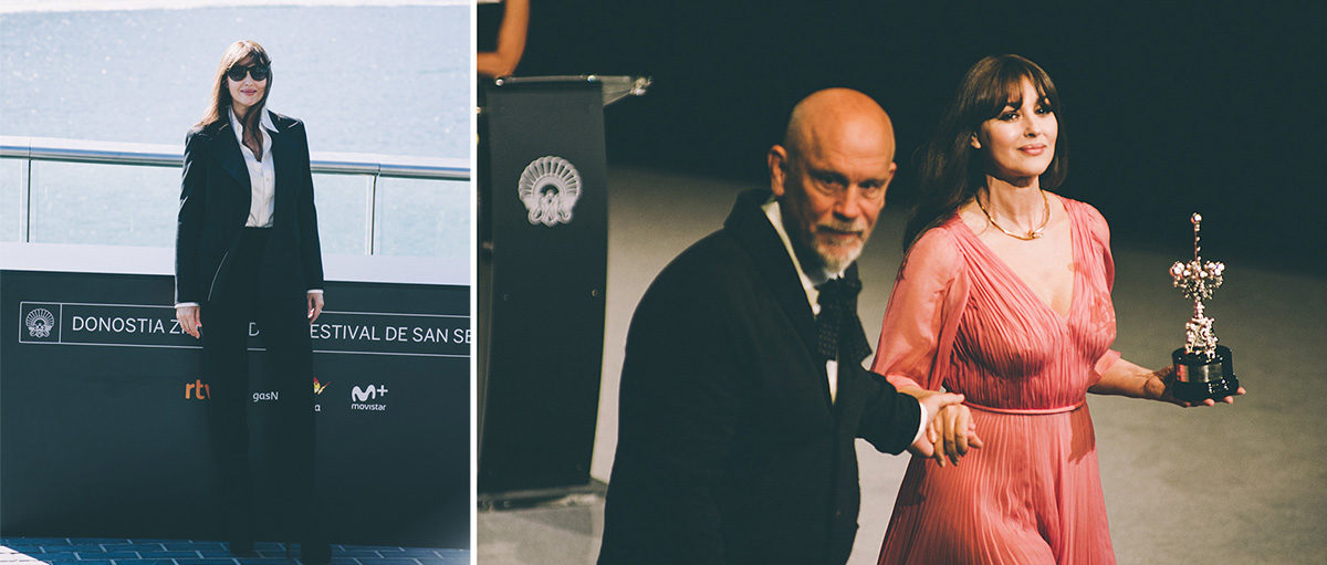 Seguro que algun@ ya pensaba que me iba a olvidar de Mónica Bellucci, pero no. Simplemente he dejado lo mejor para el final. Impresionante a sus 53 años aunque diga que la “belleza dura sólo 5 minutos”. Me ha fascinado con todos sus looks. Luciendo traje sastre masculino en negro y camisa blanca a su llegada y en la rueda de prensa. A la noche, para recoger el Premio Donostia escogió un vestido rosa plisado de Valentino con el que estaba aún más espectacular si cabe. Todo con un maquillaje súper natural.