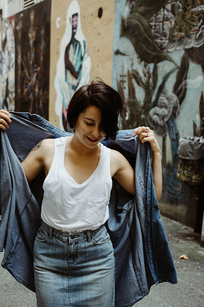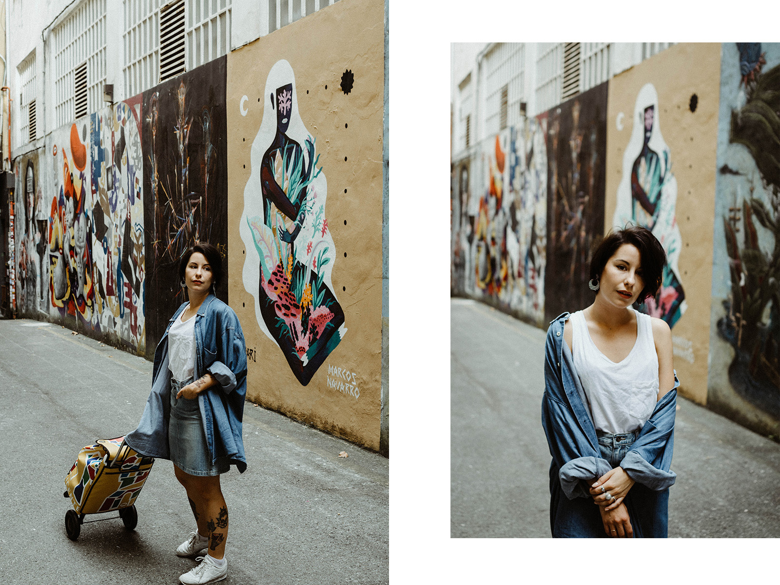 El total denim se mantiene, aunque debo reconocer que combinar tejido vaquero con él mismo me ha costado bastante, no terminaba de verlo. En Emaús Social Faktory tienen una amplia sección dedicada a este tejido y de ella hemos sacado dos prendas con las que hemos jugado al contraste, una falda más clara y una camisa amplia en tono oscuro combinados con dos básicos imprescindibles: camiseta y zapatilla blancas. Completamos el look con un carro de la compra confeccionado por Sin Desperdicio, la firma de complementos reciclados que forma parte de Emaús Fundación Social. Está realizado con la tela de las banderolas publicitarias que podemos ver por Donostia, en los paseos de La Concha o la Zurriola.