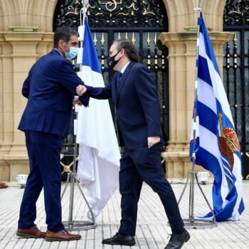 Los intercambios de las enseñas han terminado hoy en la Diputación y el Ayuntamiento donostiarra