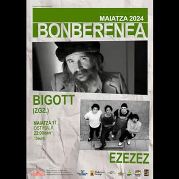 Cultura, NoticiaBigott y ezezez tocarán en Bonbenerea de Tolosa Por A. E. / Redacción / 10 mayo, 2024 La cita será el 17 de mayo a las 22 horas