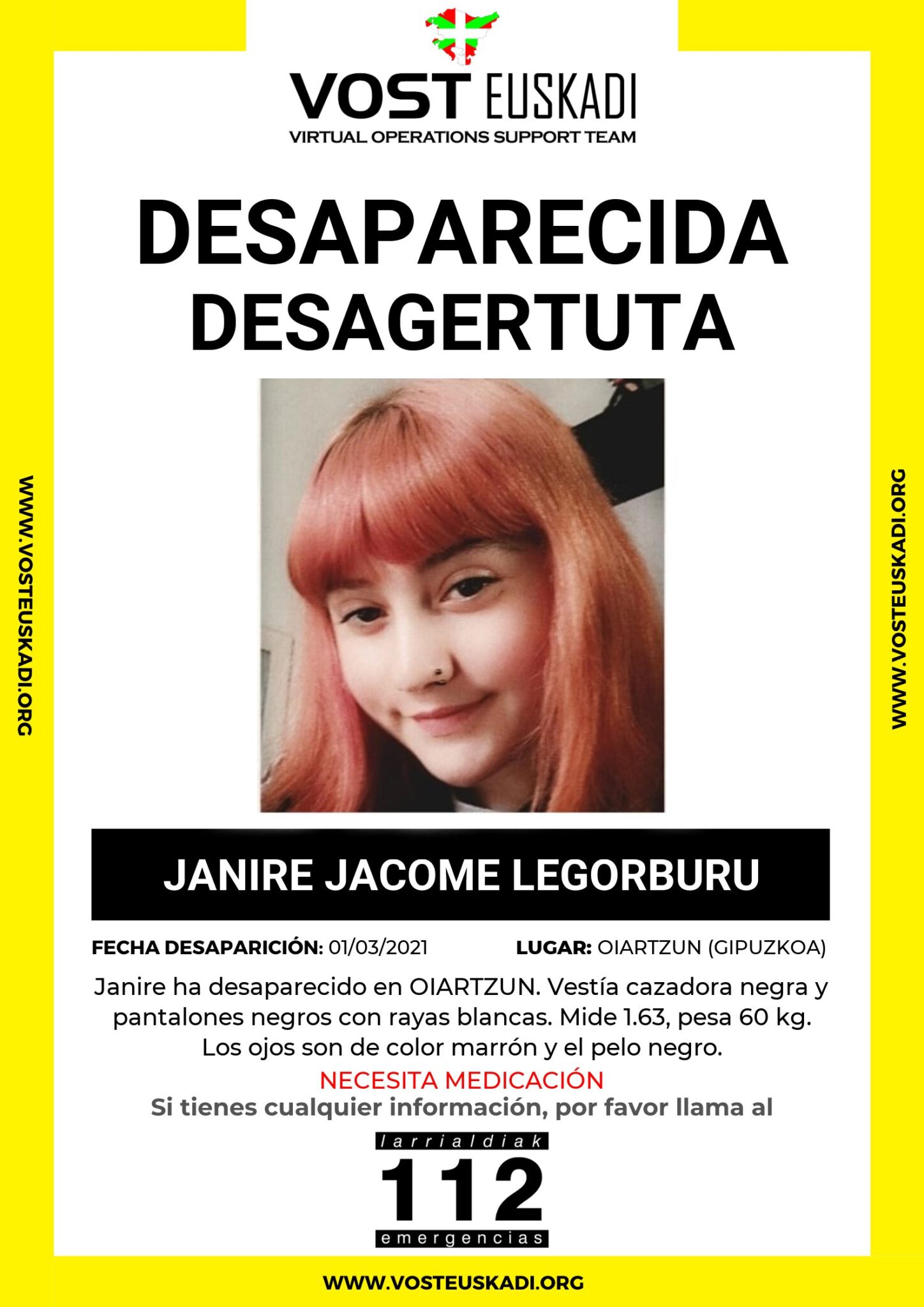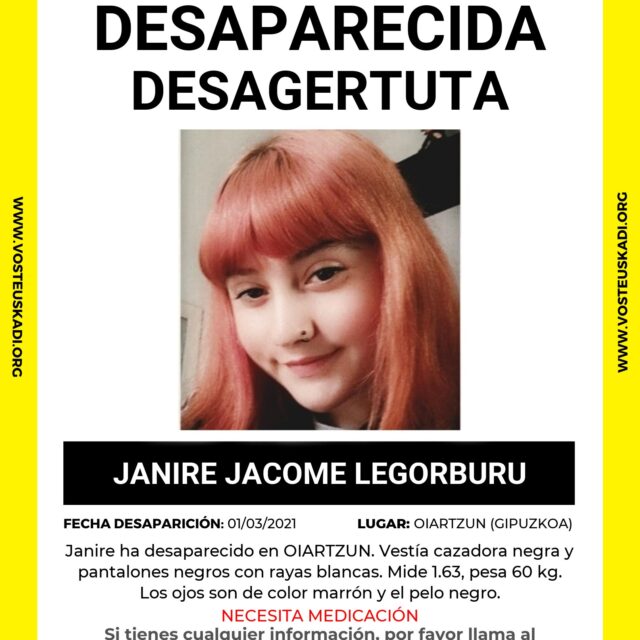 Quien sepa algo sobre el paradero de Janire Jacome Legorburu puede llamar al 112