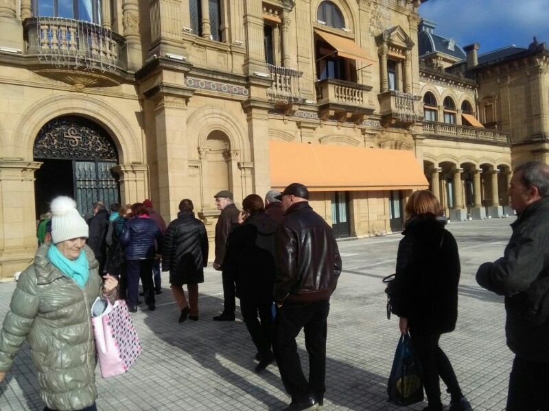 11etatik aurrera ehundaka lagun bildu dira Udaletxearen sarreran Donostiako Udaleko 2018ko Udal egutegiaren aleren bat eskuratzeko. Aleak agortu arte, eta