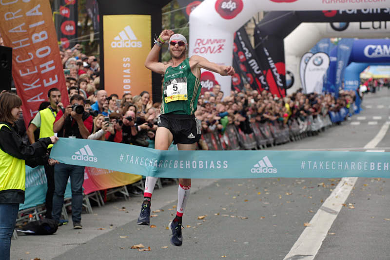 El catalán Jaume Leiva con 1:00:20 en la modalidad masculina (rozando el récord de 2016 por tan sólo tres segundos) y la canaria Aroa Merino con 01:09:41 han triunfado hoy en la Behobia-San Sebastián en esta edición 54 que ha transcurrido con buena temperatura y sin lluvia, lo que ha vuelto a congregar a miles de personas durante todo el circuito en la que sin duda es una de las mayores fiestas deportivas del Estado.