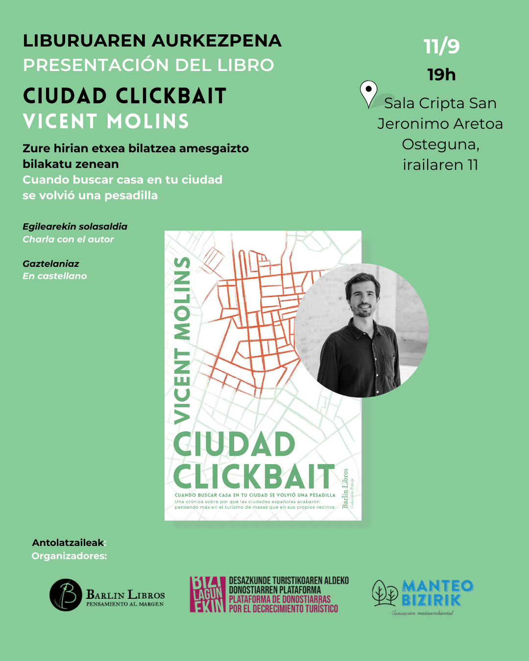 Entrevista con el periodista y geógrafo Vicent Molins, que ha presentado su libro ‘Ciudad Clickbait’, sobre los efectos del turismo, en la Cripta de San Jerónimo en Donostia