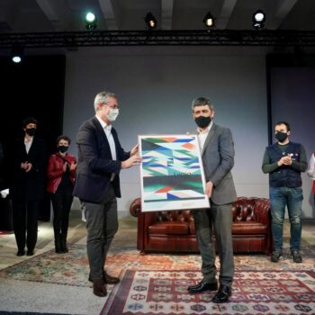 El diputado general de Gipuzkoa, Markel Olano, entrega el galardón a los representantes de las ocho cooperativas que integran el grupo industrial
