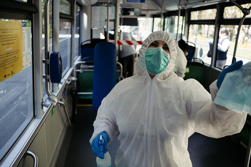 Con atuendos que hace muy poco tiempo nos hubieran llamado la atención, equipos de operarias limpian los autobuses en el