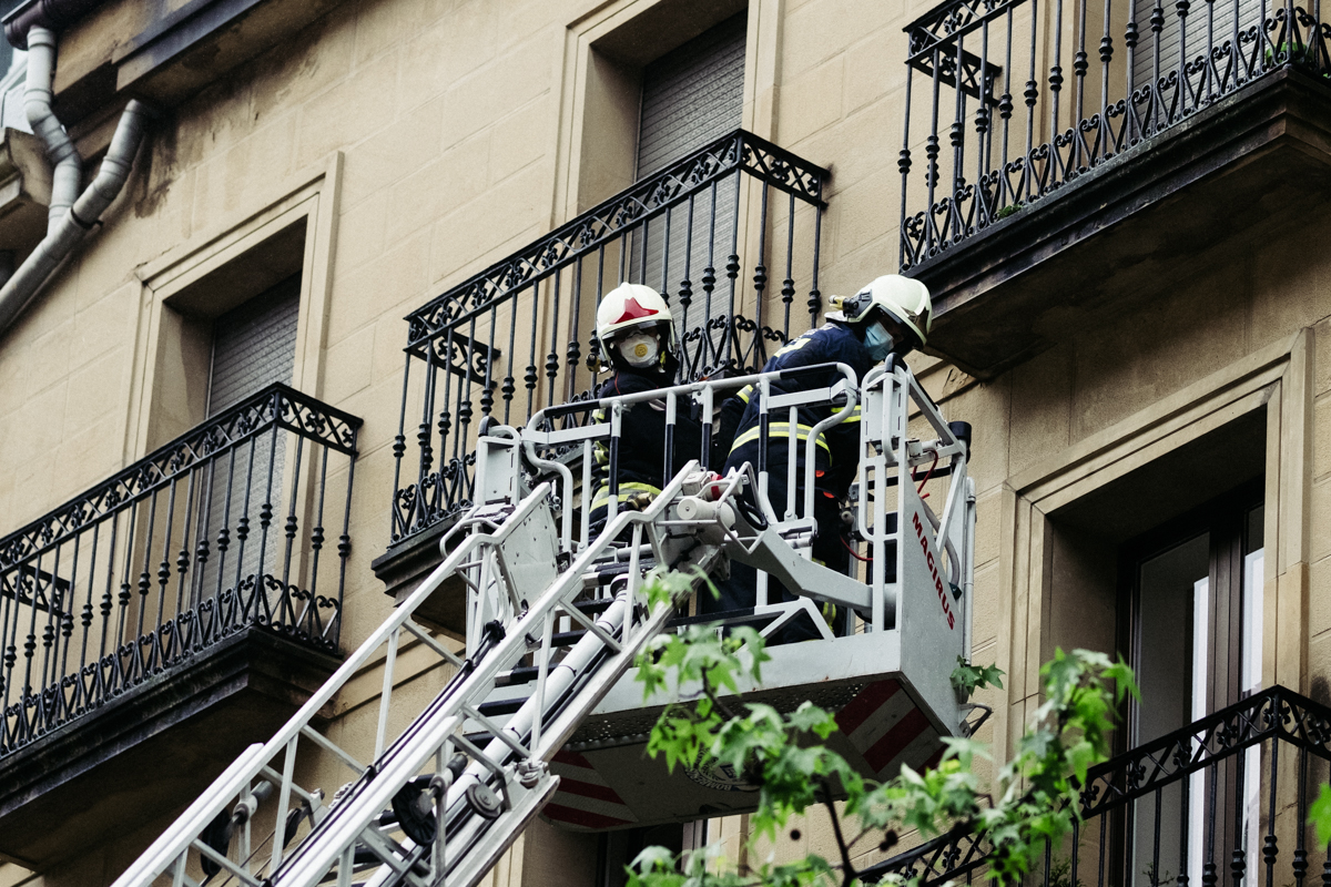Este mediodía los bomberos se afanaban por fijar las piezas que se desprendían de un balcón de la calle Garibay