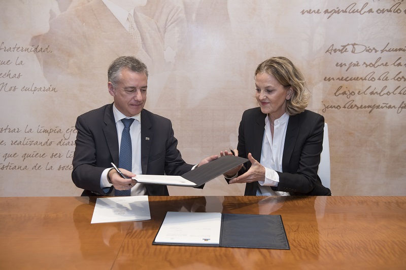 El Lehendakari Iñigo Urkullu y la vicepresidenta de la Fundación Amancio Ortega, Flora Pérez, han firmado esta mañana en la