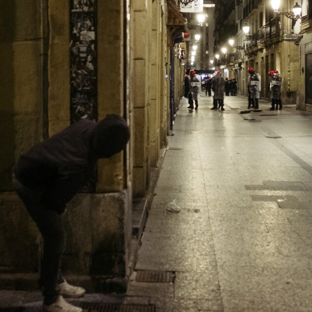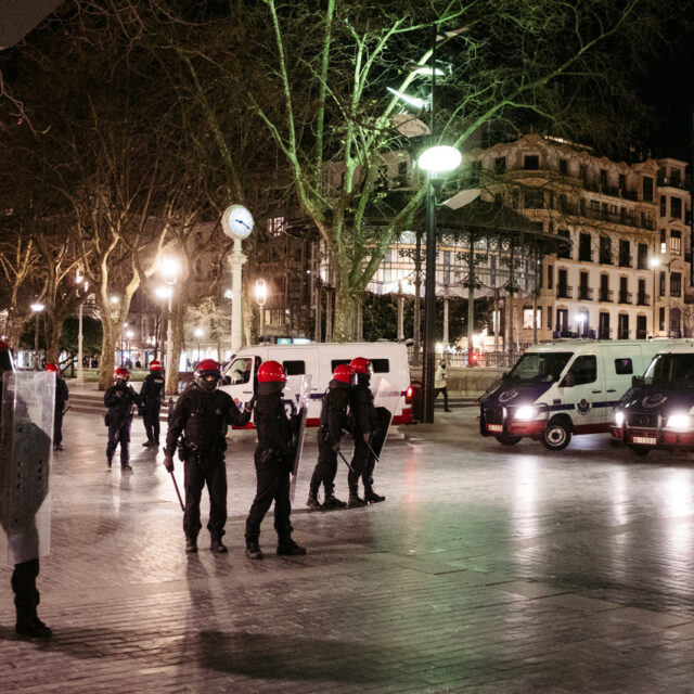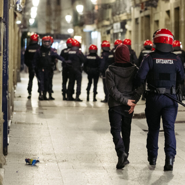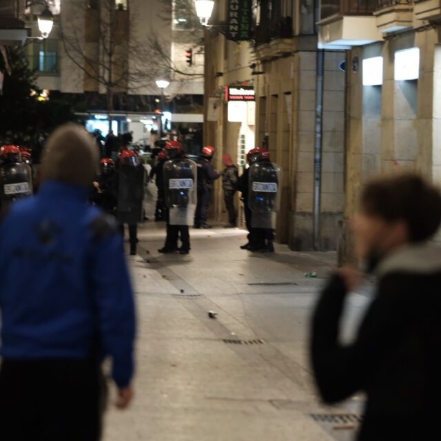 La Ertzaintza supo de la existencia de grupos que estaban cruzando contenedores alrededor de la Plaza de la Constitución y fueron recibidos en algunos casos con el lanzamiento de piedras y botellas