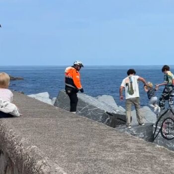 Un padre ha saltado a las rocas junto a sus tres hijos pequeños para obtener una mejor imagen