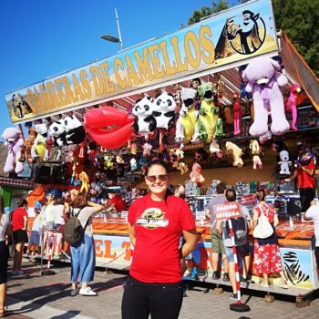 Lara Ortega es una de las pocas mujeres que dirigen una atracción en el Paseo Nuevo. Suya es la popular carrera de camellos. Esta es su primera feria tras un parón de año y medio