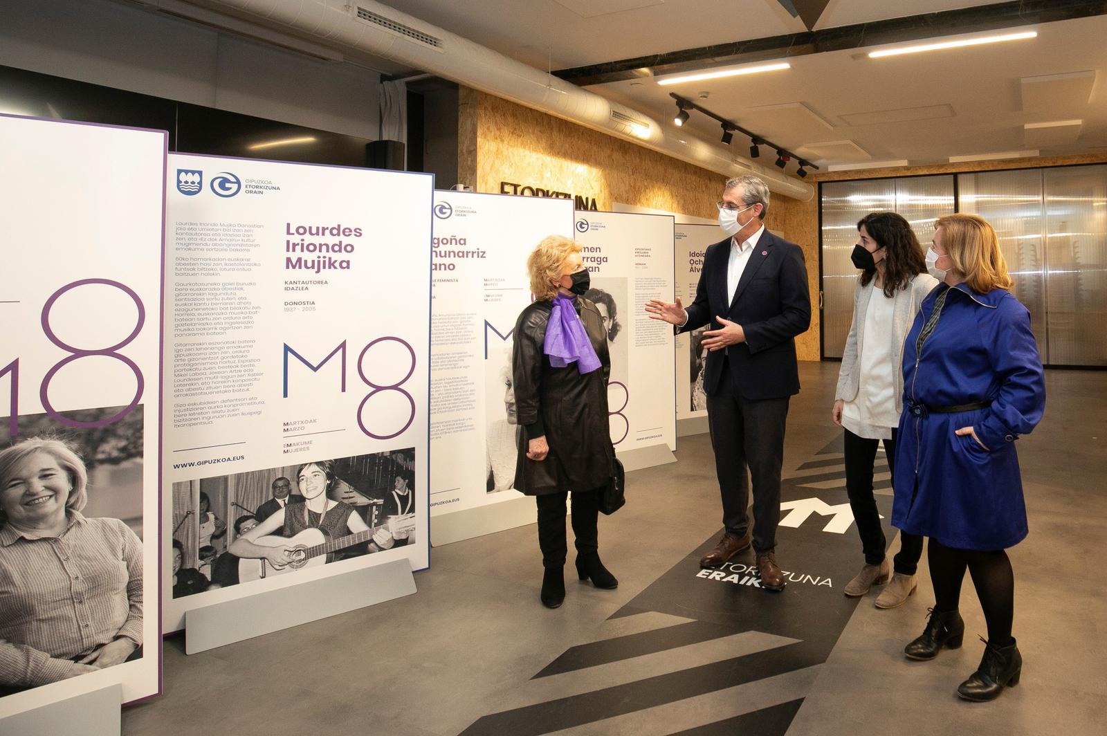 La Diputación pone de relieve las figuras de Elbira Zipitria (pedagoga), Esther Ferrer (artista), Catalina de Erauso (militar y escritora), Ana Belén Juaristi (empresaria), Lourdes Iriondo (cantautora), Begoña Amunarriz (política), Carmen Adarraga (deportista) e Idoia Ochoa (investigadora)