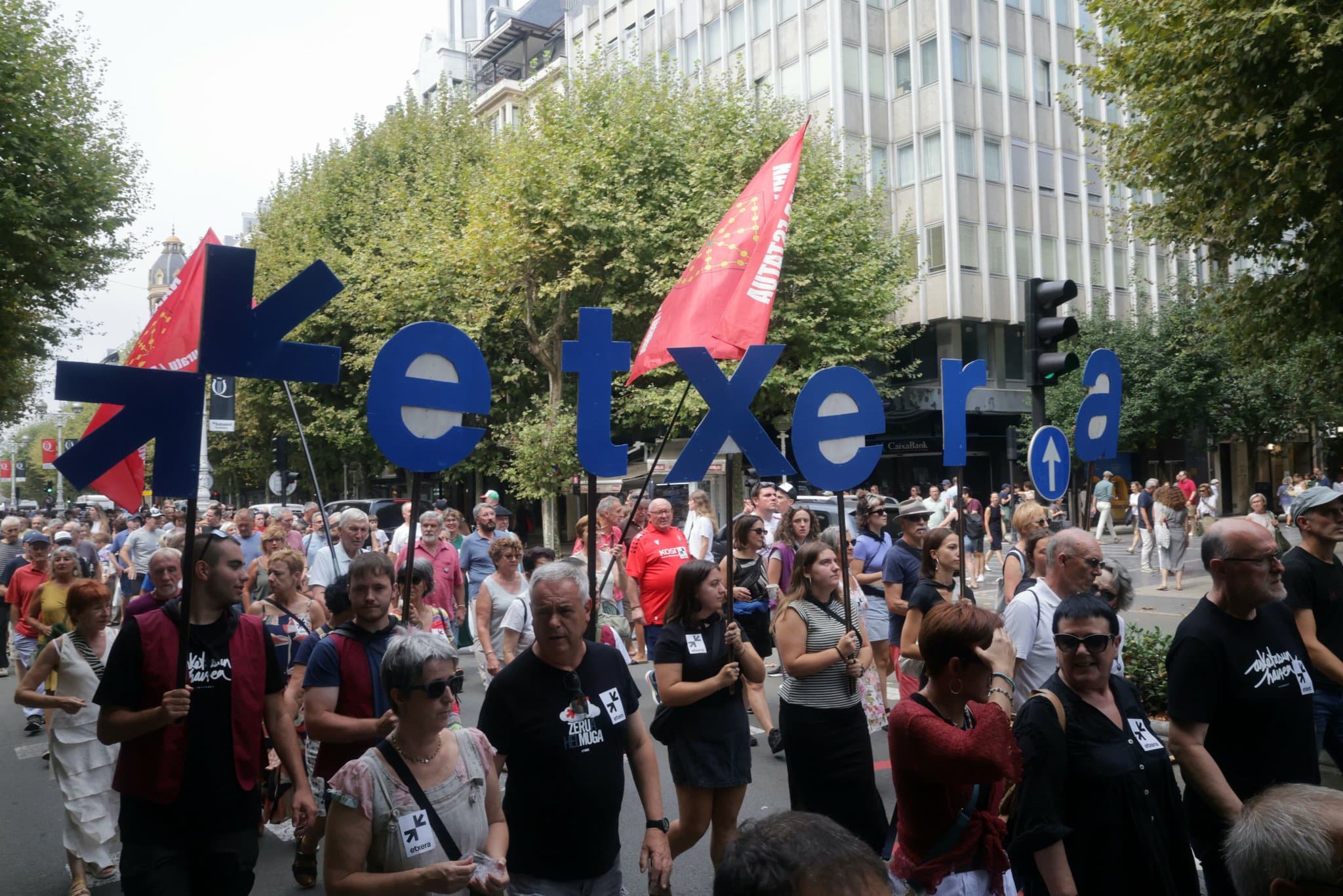 La protesta en San Sebastián ha partido a las 12.00 horas del área del Club Náutico encabezada por una pancarta con la leyenda «Etxera»