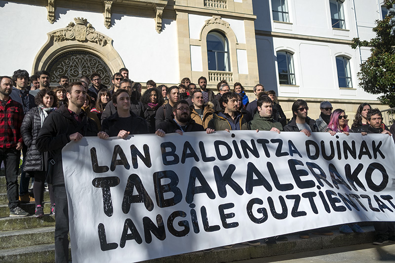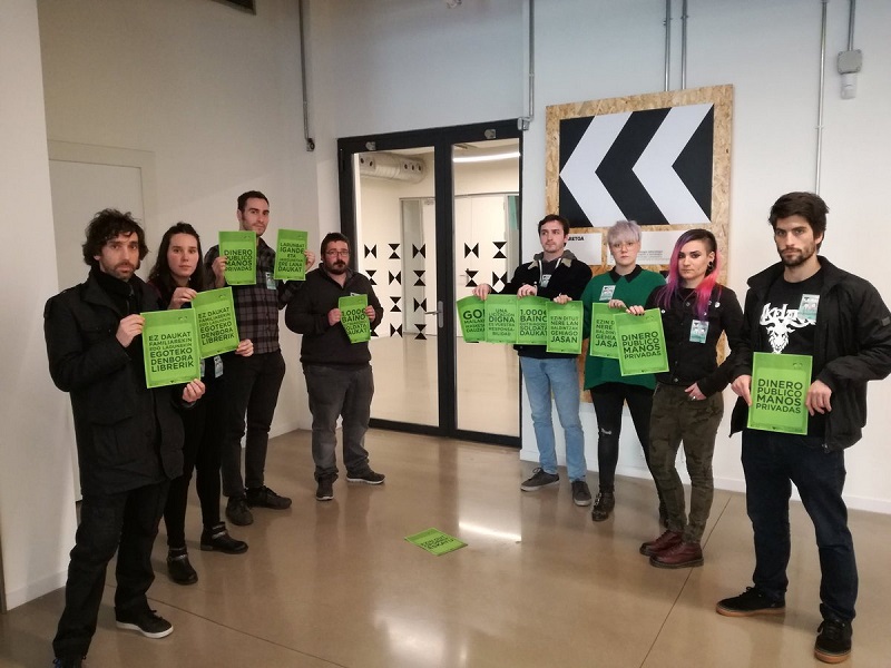 Medio centenar de trabajadores de distintos servicios presentes en Tabakalera se ha concentrado hoy en la puerta principal con dos