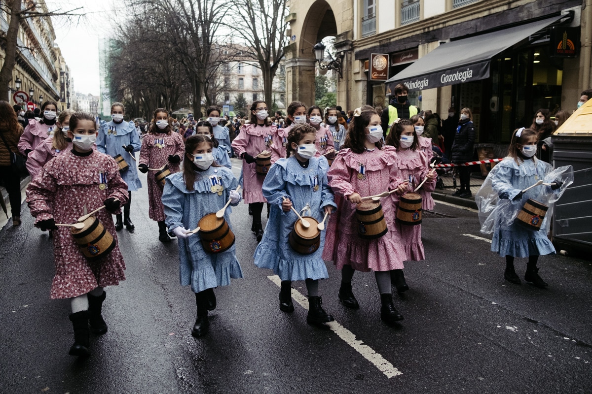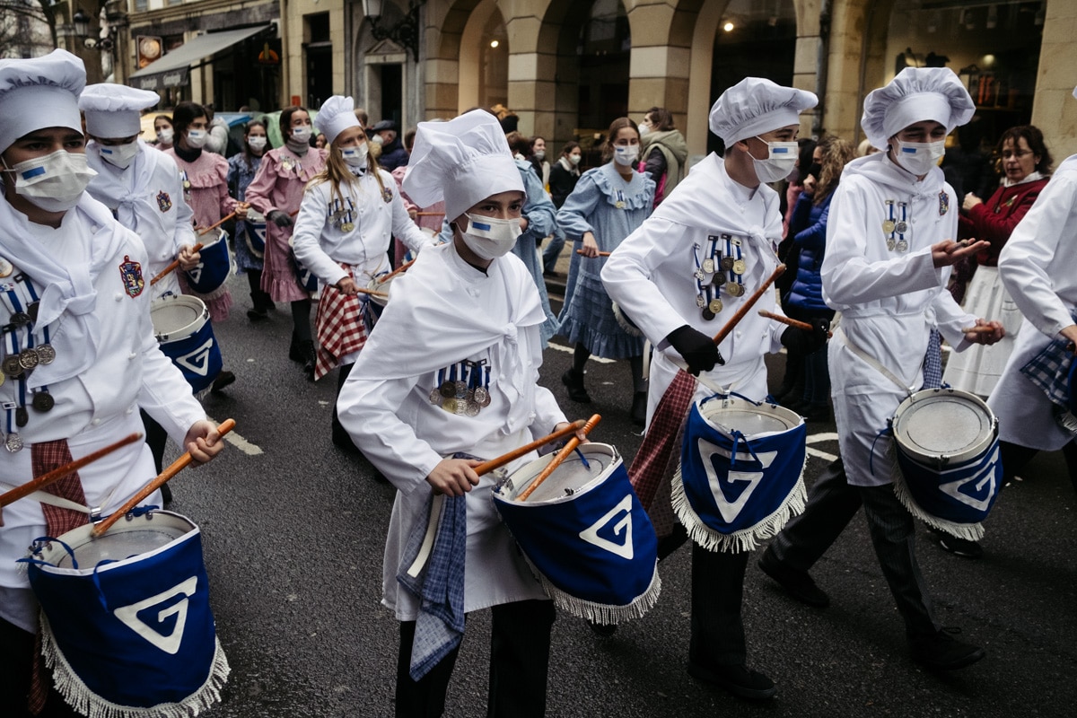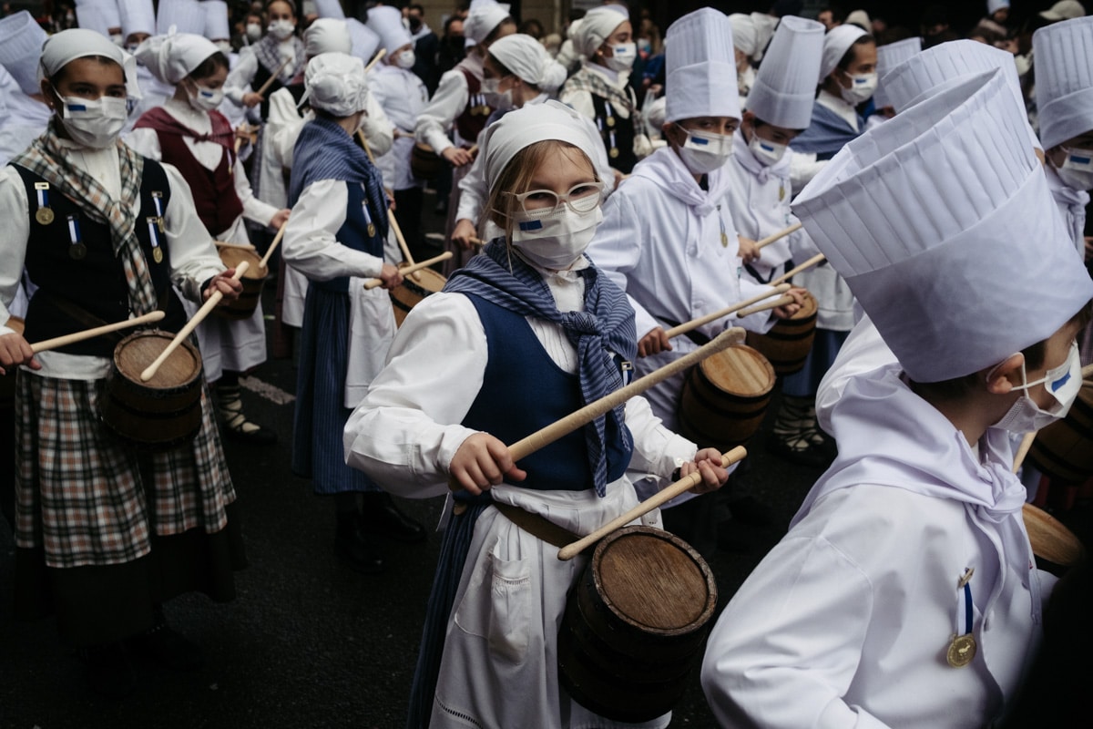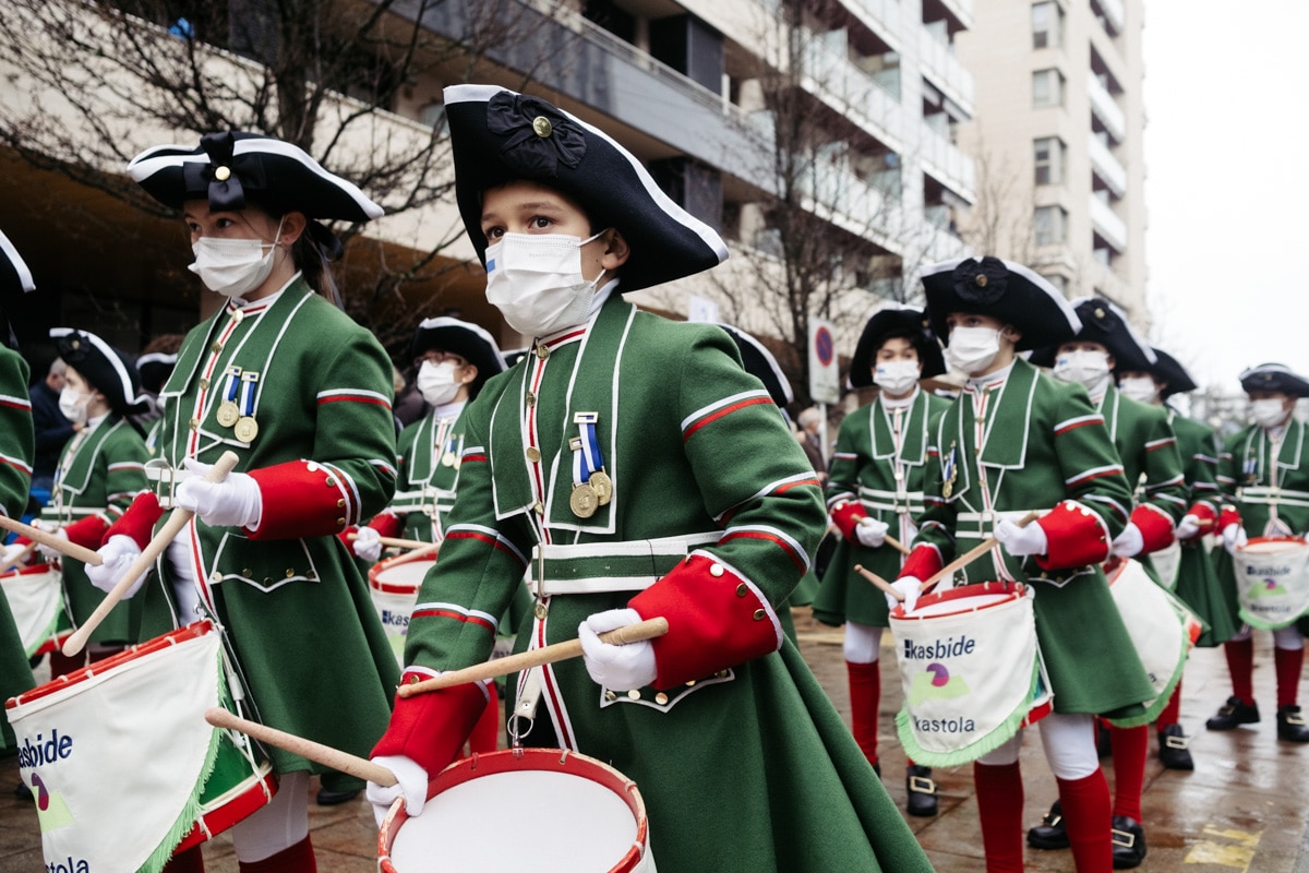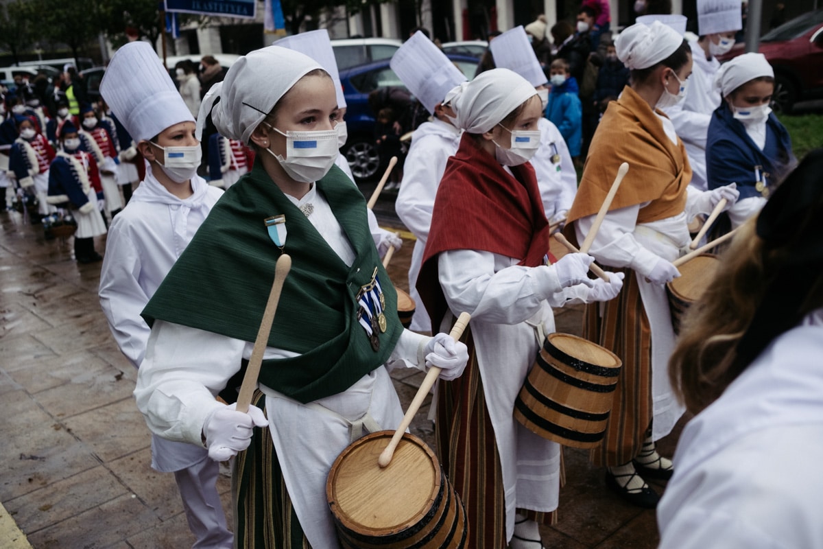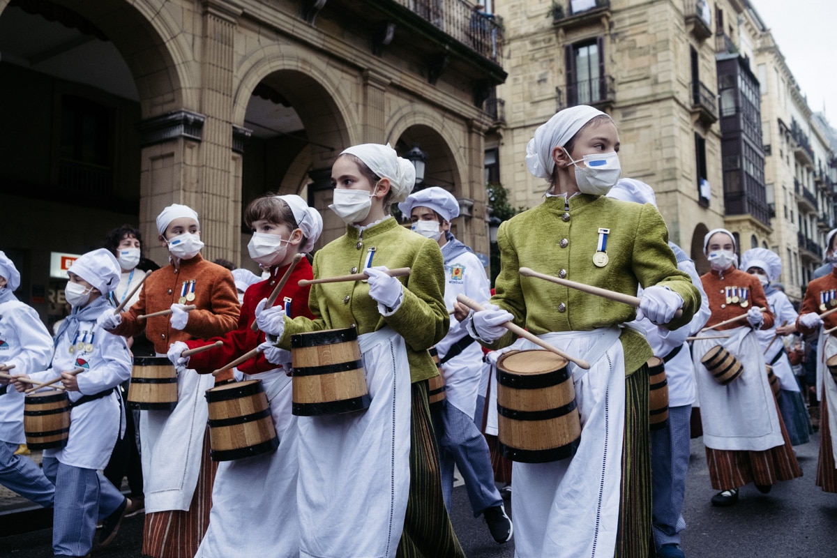 La Tamborrada infantil de este mediodía en Donostia, con las compañías separadas en cinco trayectos distintos, evitando aglomeraciones y con distancias, pasará a la historia como ‘la tamborrada del covid’.