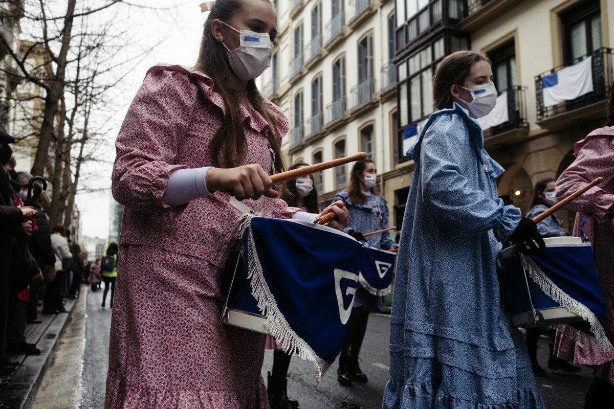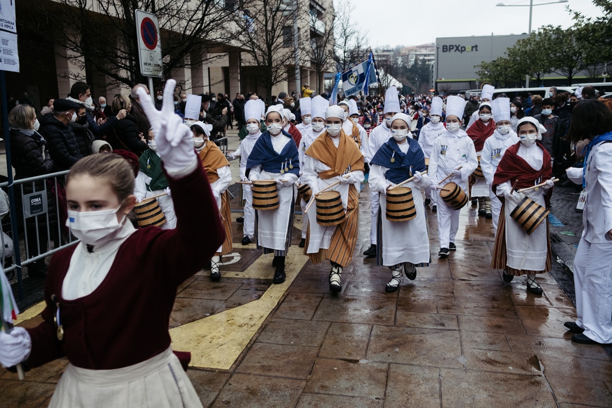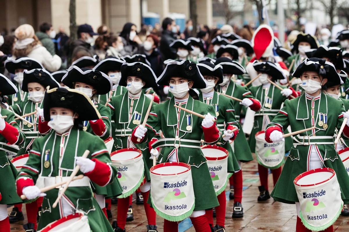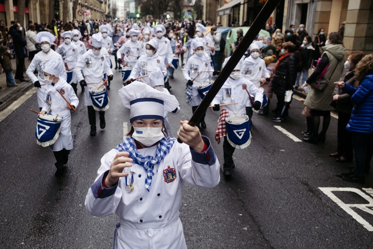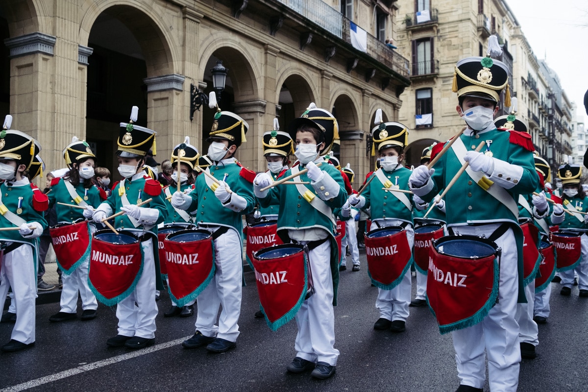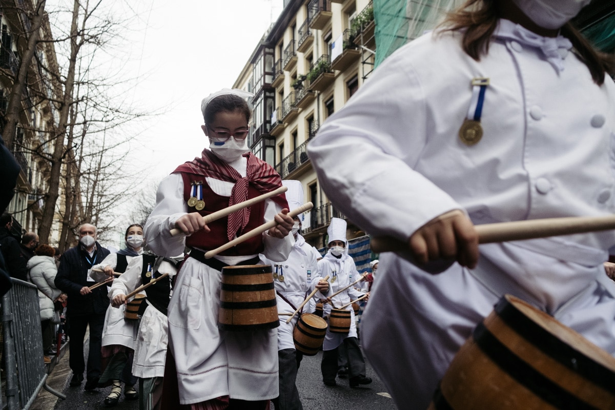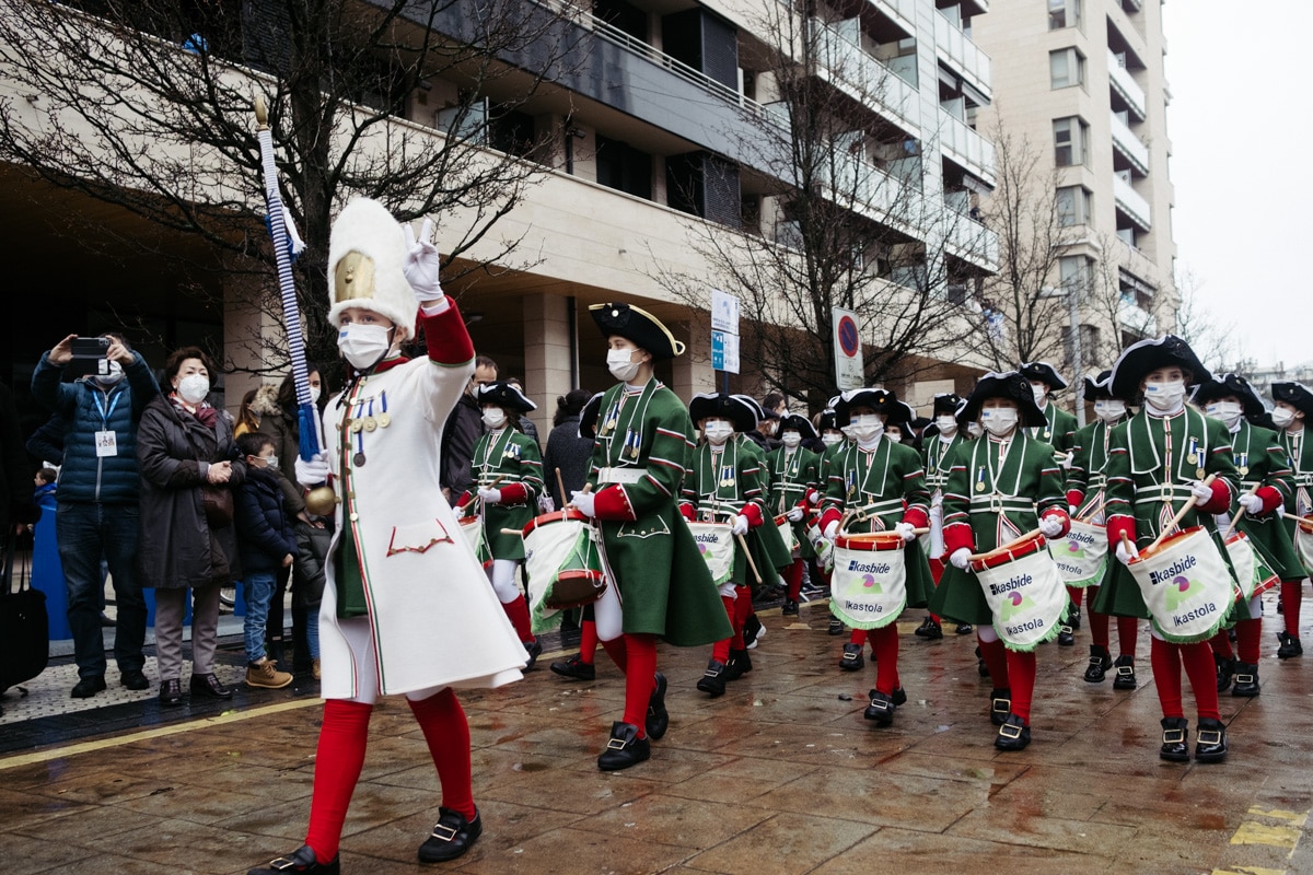 La Tamborrada infantil de este mediodía en Donostia, con las compañías separadas en cinco trayectos distintos, evitando aglomeraciones y con distancias, pasará a la historia como ‘la tamborrada del covid’.