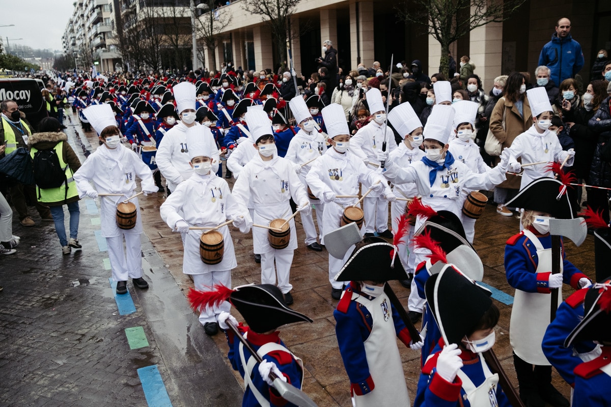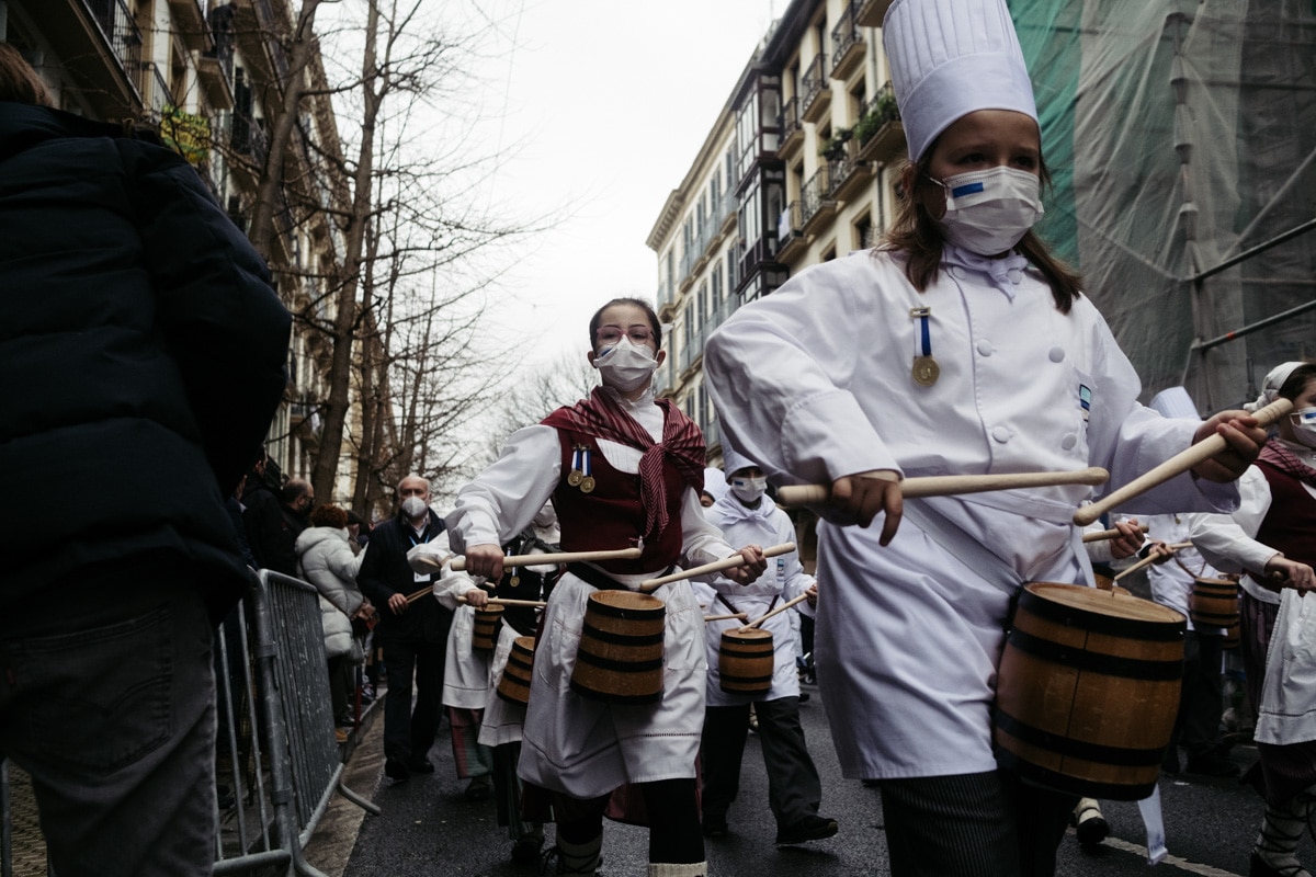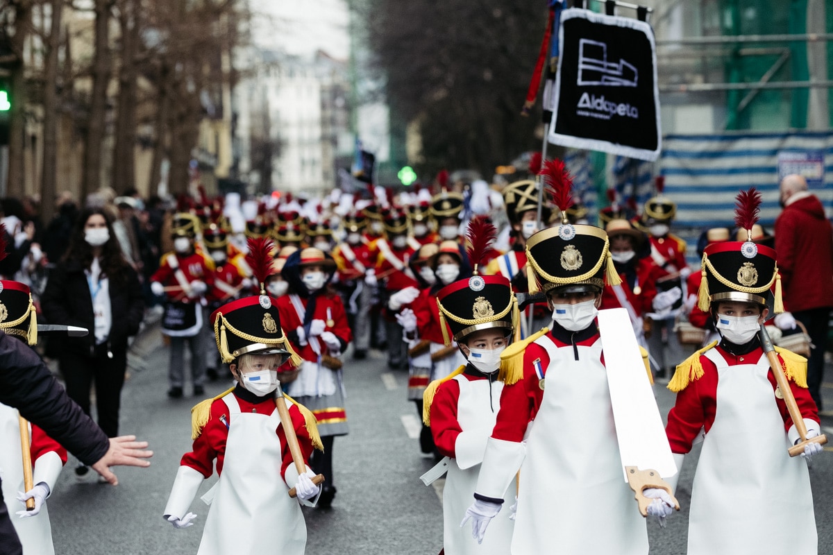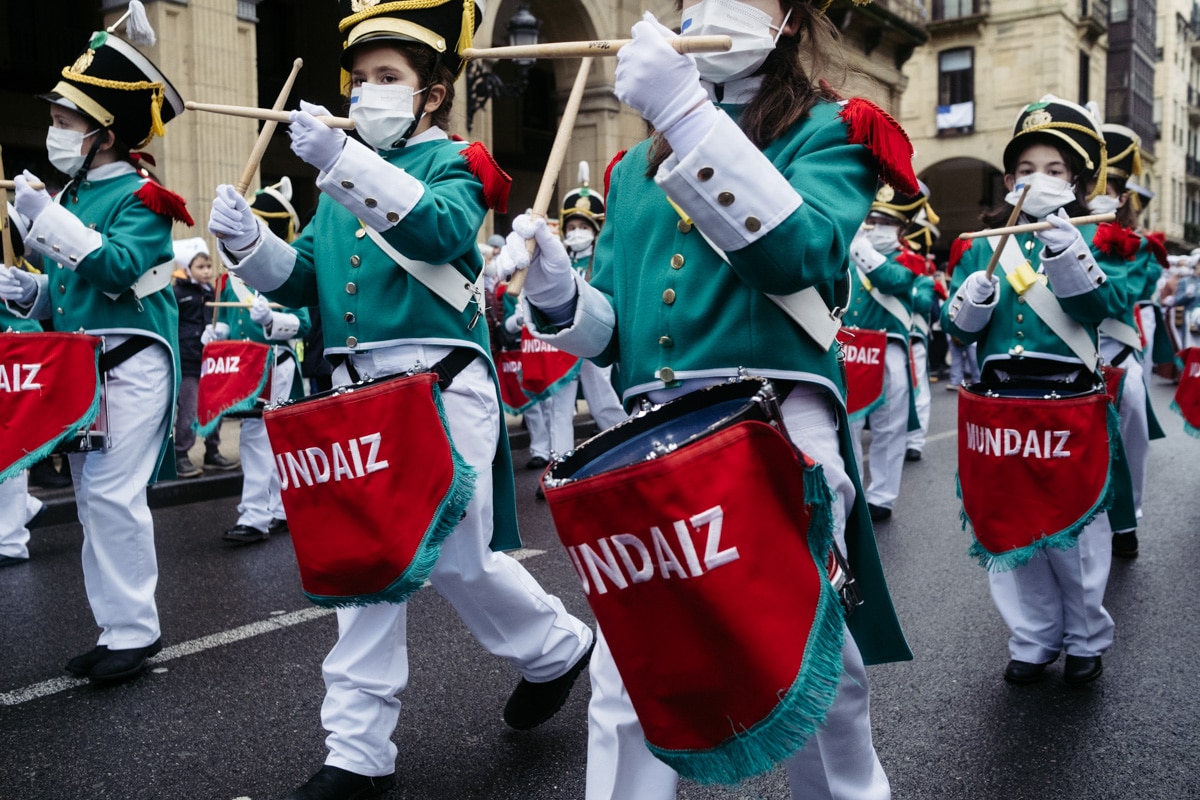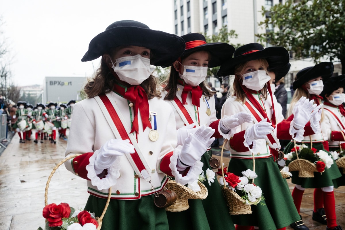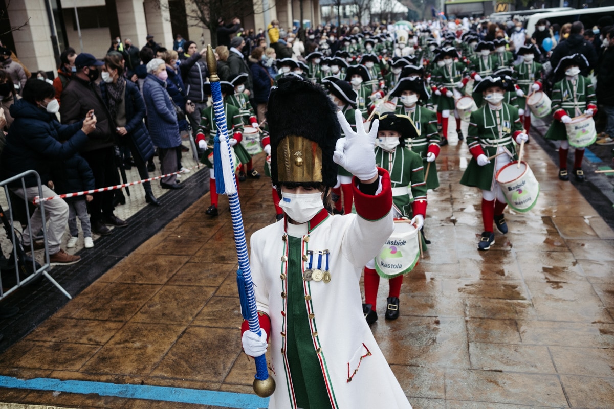 La Tamborrada infantil de este mediodía en Donostia, con las compañías separadas en cinco trayectos distintos, evitando aglomeraciones y con distancias, pasará a la historia como ‘la tamborrada del covid’.