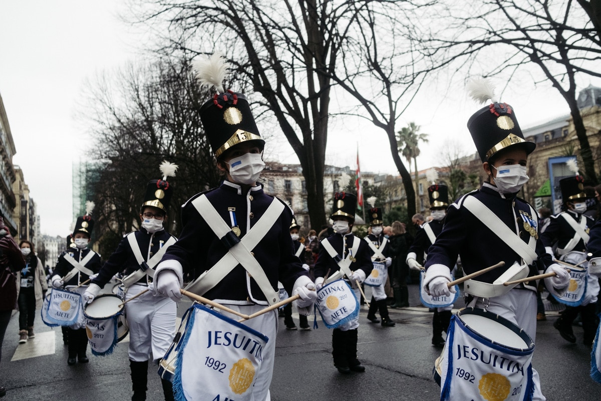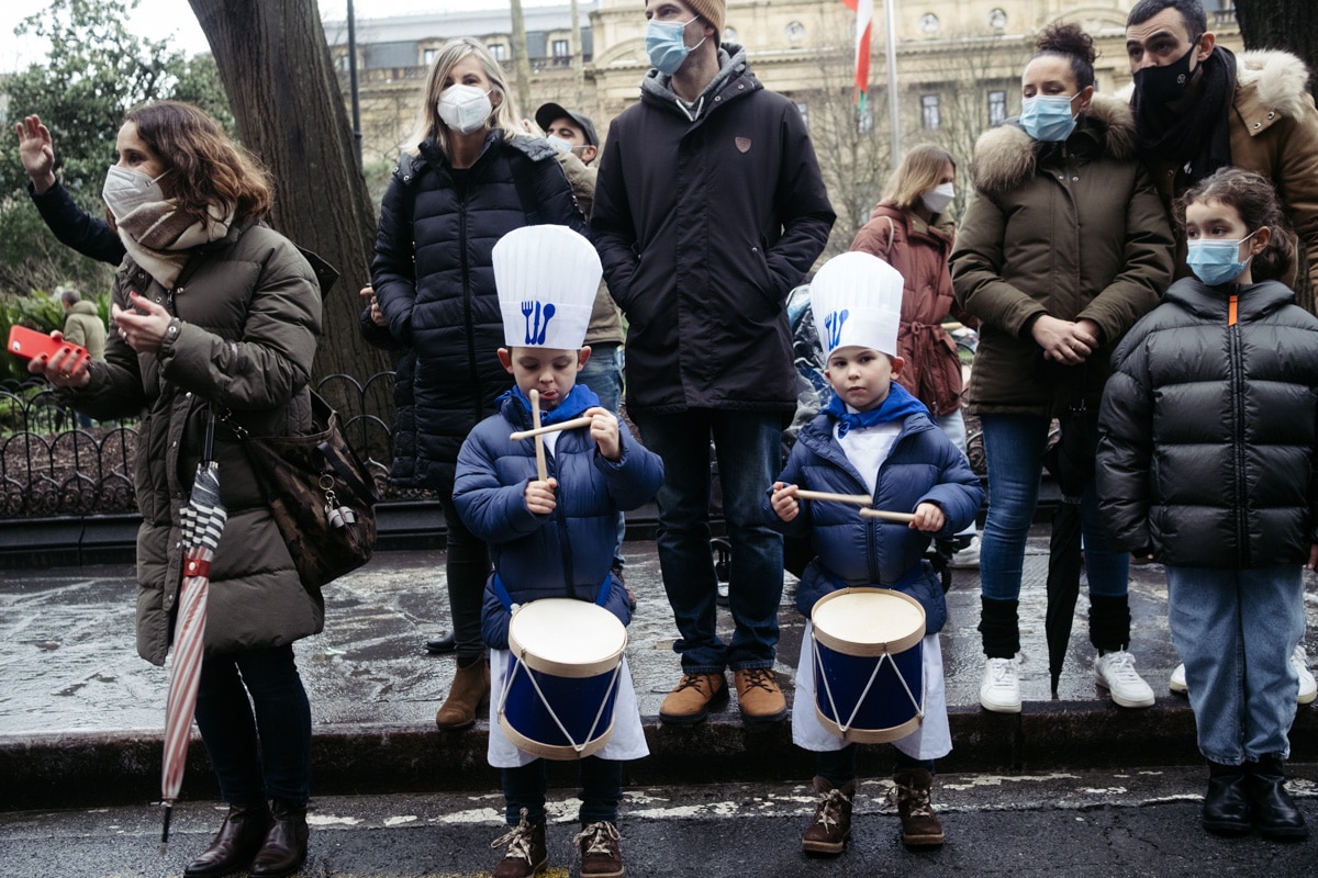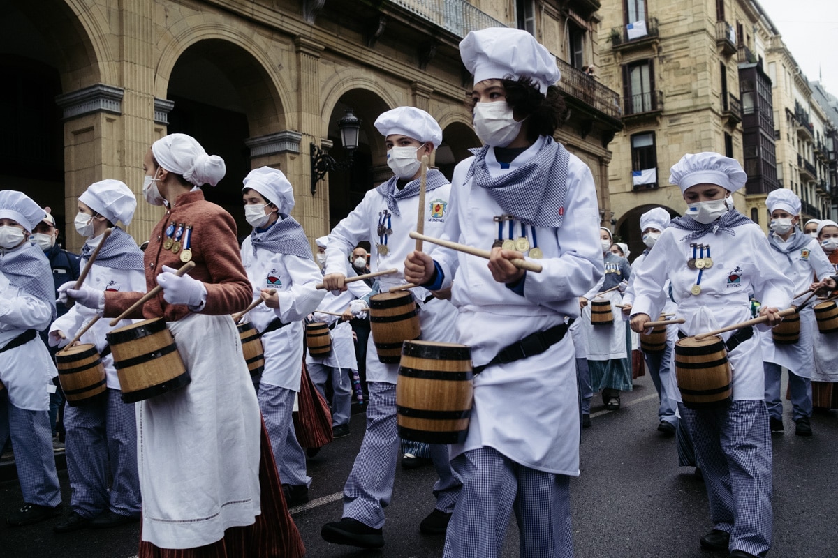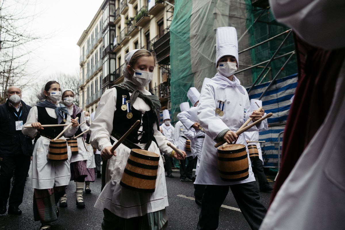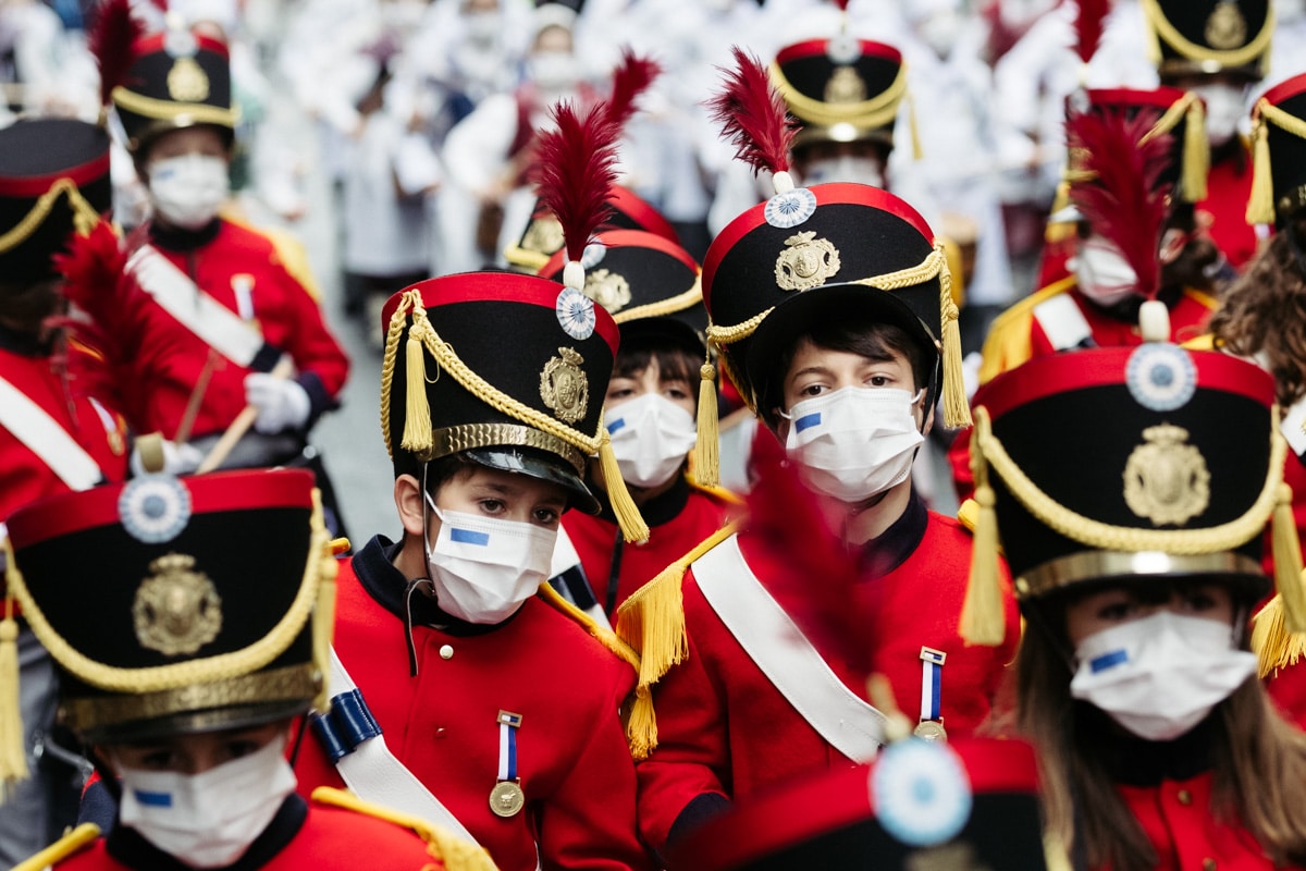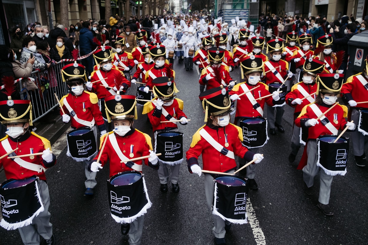 La Tamborrada infantil de este mediodía en Donostia, con las compañías separadas en cinco trayectos distintos, evitando aglomeraciones y con distancias, pasará a la historia como ‘la tamborrada del covid’.