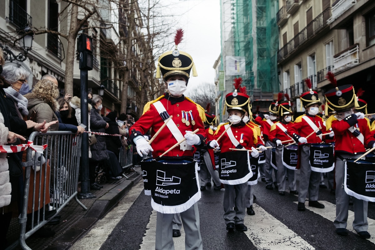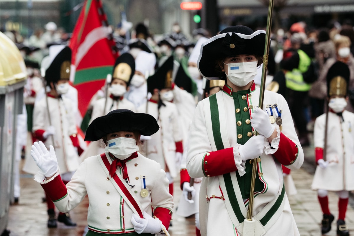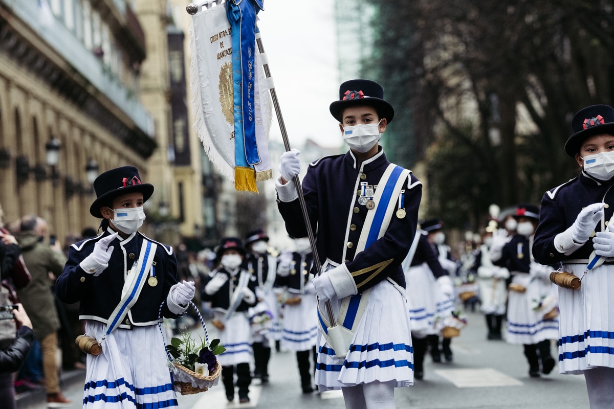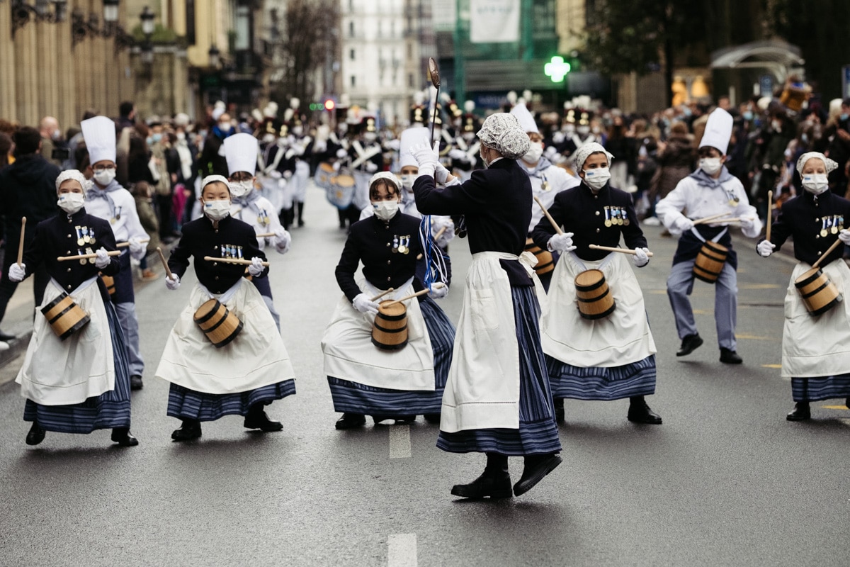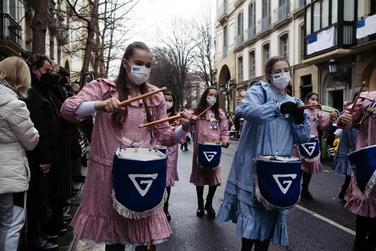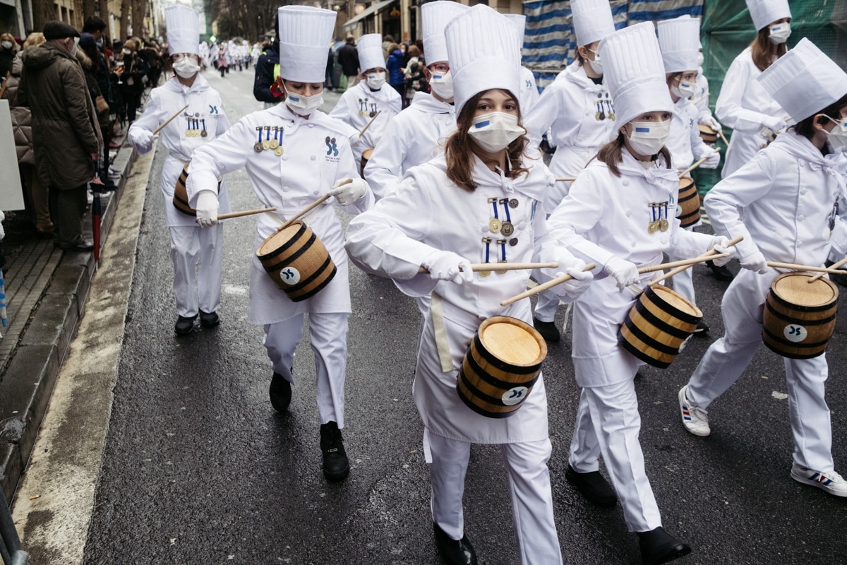 La Tamborrada infantil de este mediodía en Donostia, con las compañías separadas en cinco trayectos distintos, evitando aglomeraciones y con distancias, pasará a la historia como ‘la tamborrada del covid’.
