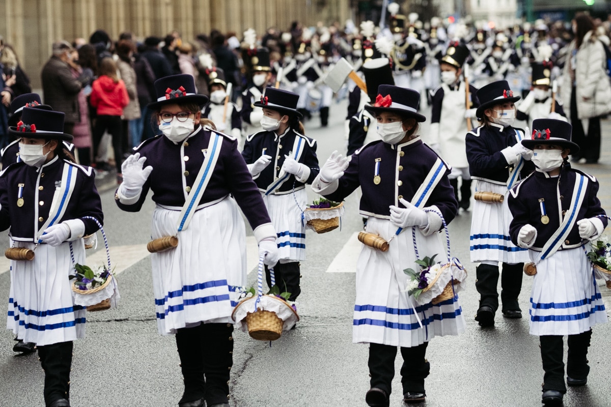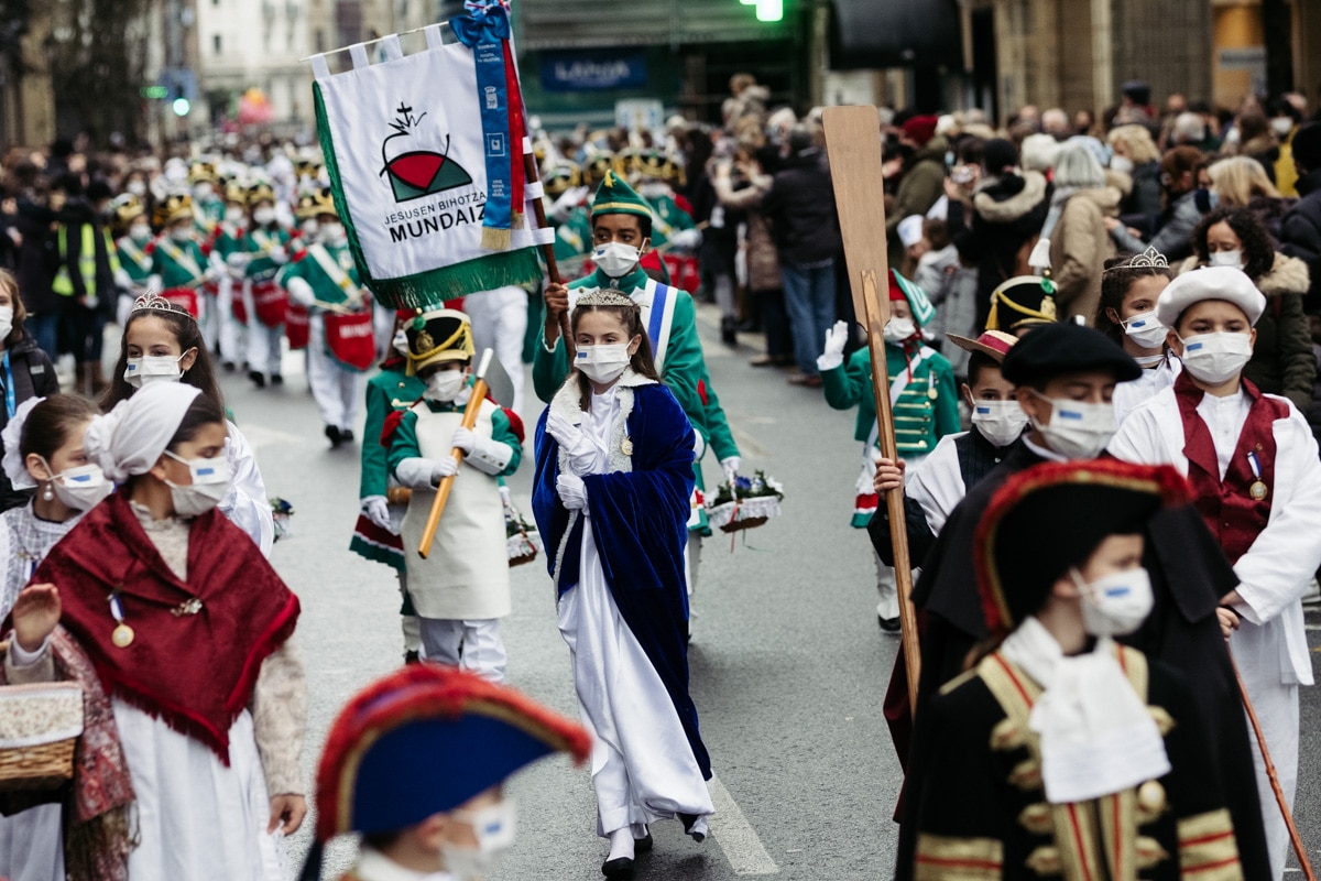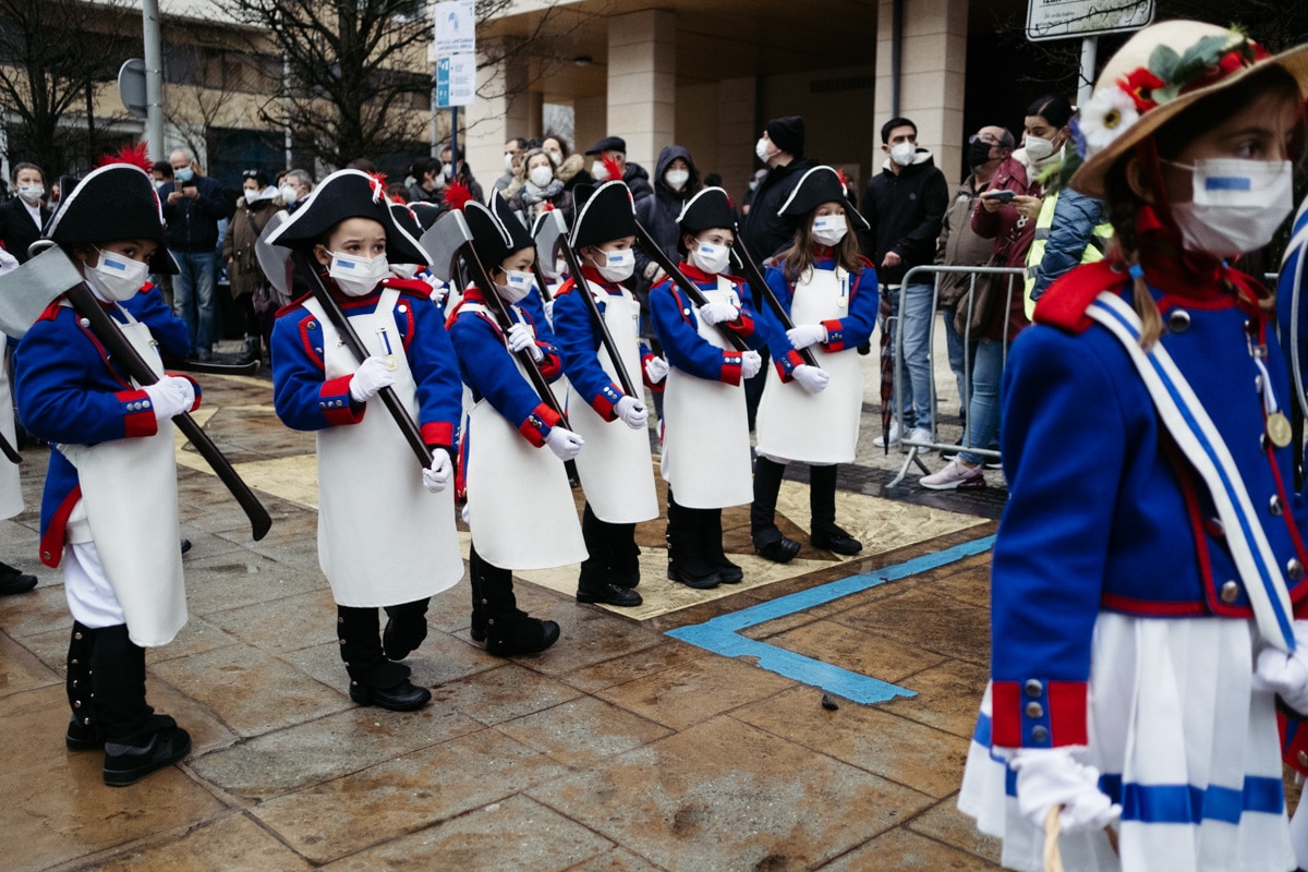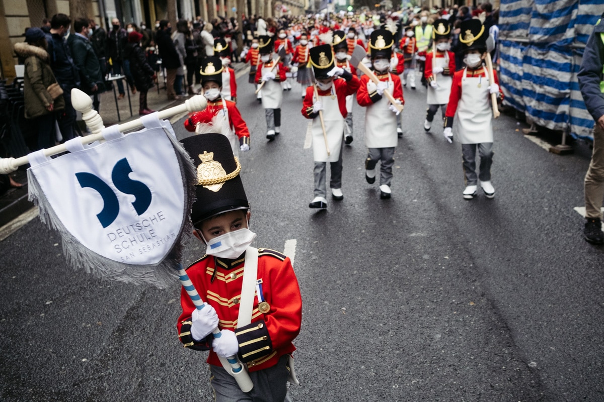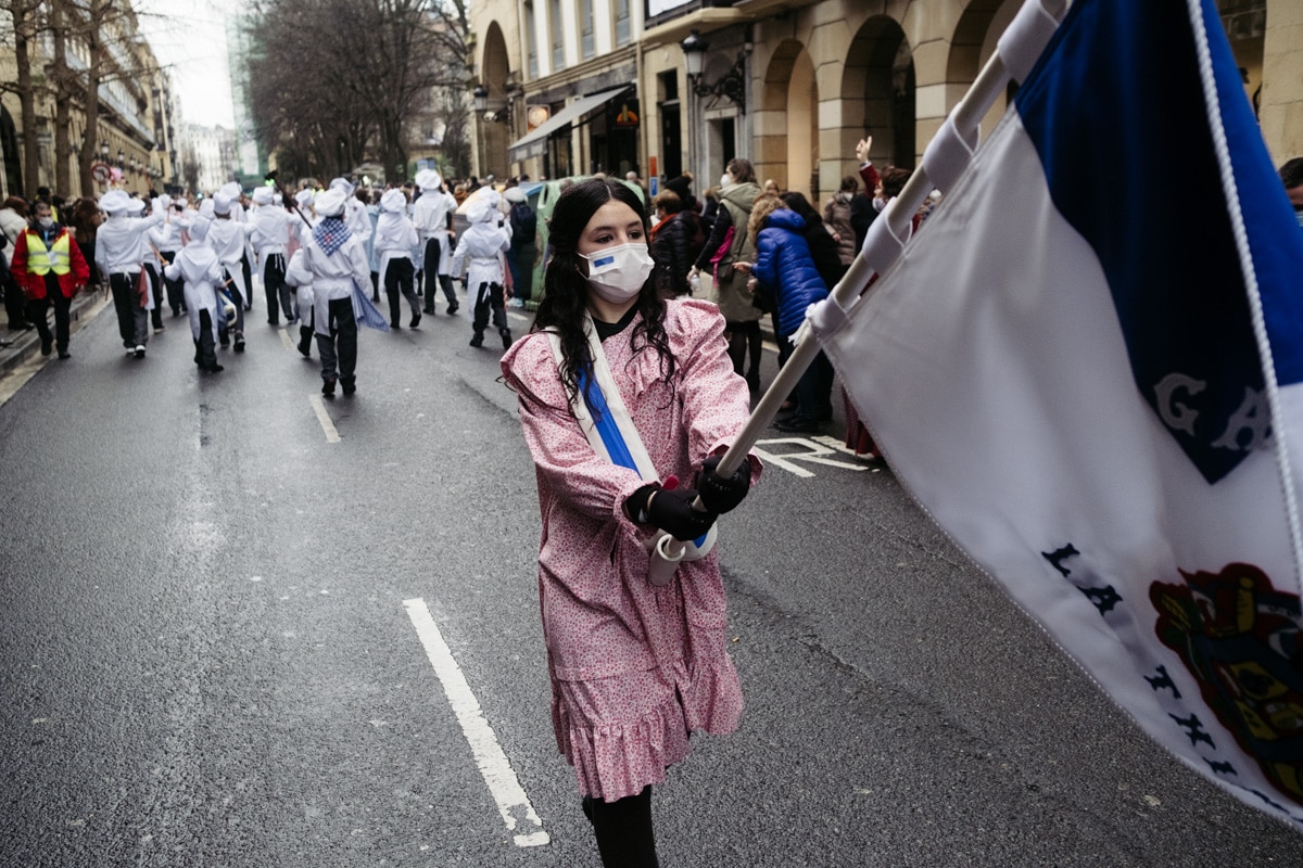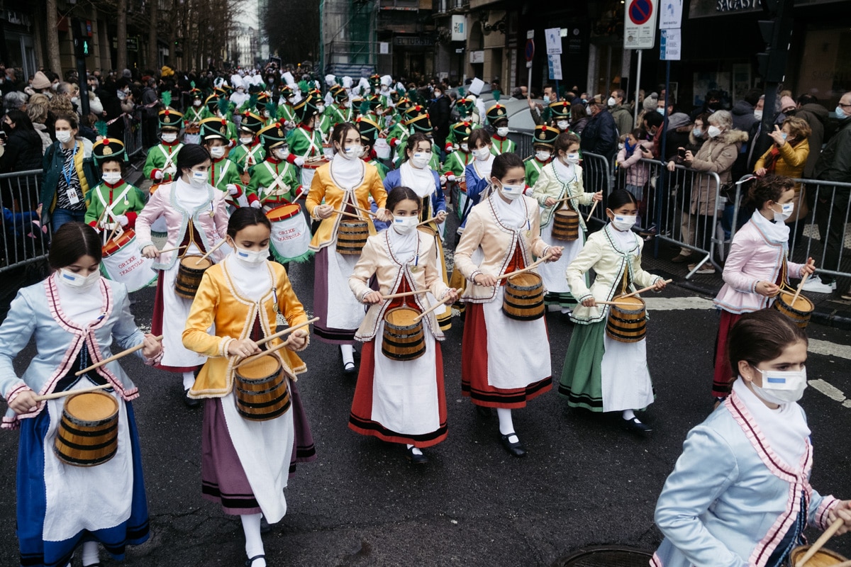 La Tamborrada infantil de este mediodía en Donostia, con las compañías separadas en cinco trayectos distintos, evitando aglomeraciones y con distancias, pasará a la historia como ‘la tamborrada del covid’.