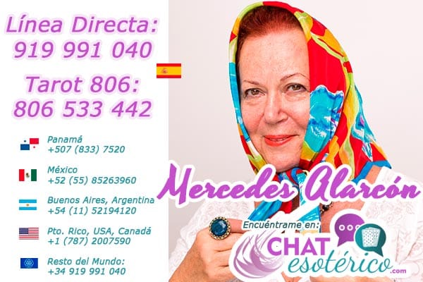 También, aquellas personas que se encuentran en otros países, pero desean que la adivina Mercedes Alarcón, los atienda, no deben preocuparse por la diferencia horaria. Recuerda que la prioridad eres tú y tu comodidad. Por lo tanto, no importa si en tu región es de día, noche o madrugada; las líneas telefónicas de Mercedes Alarcón, siempre están abiertas. Además, puedes comunicarte con Mercedes Alarcón a través de, chats en línea por medio del sitio web CHATESOTERICO.COM. Nada más, debes registrarte en la página web y podrás conversar con ella.