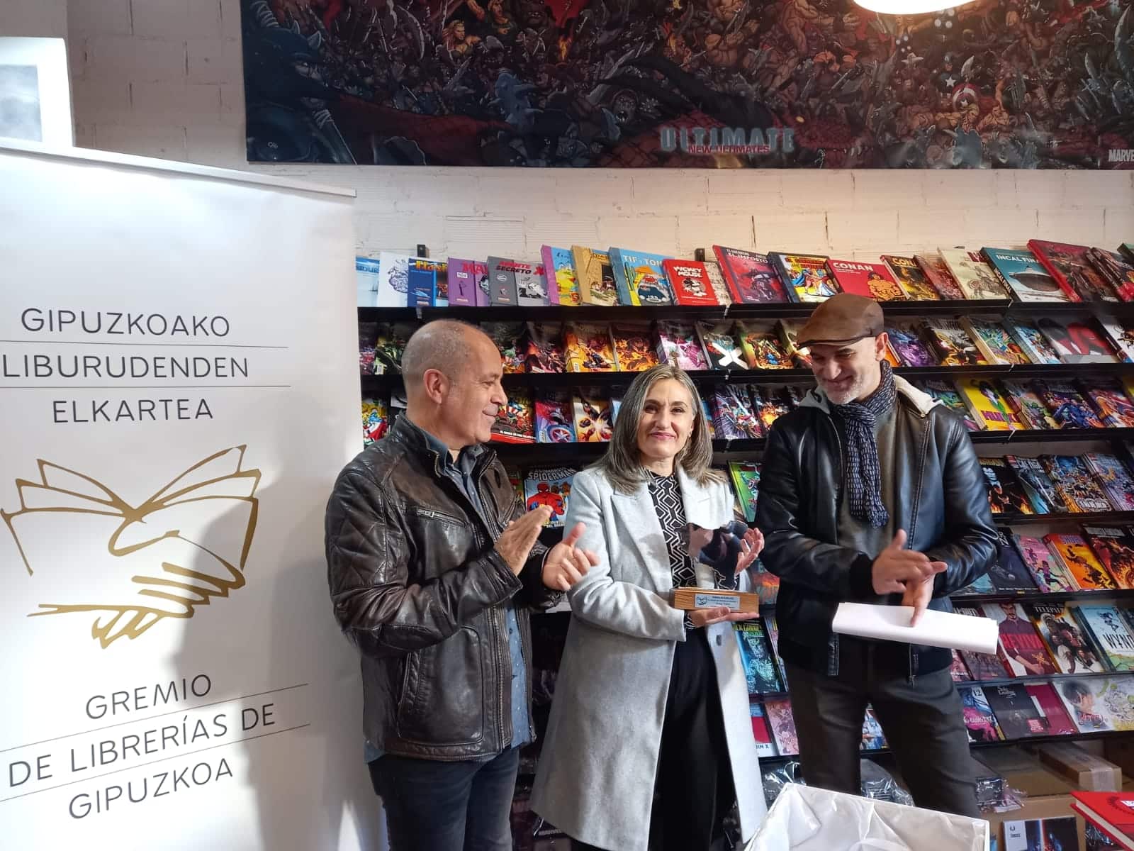 Teresa Valero, la autora de ‘Contrapaso. Los hijos de los otros’, ha recogido hoy el primer Euskadi de Plata en categoría de cómic. El Gremio de Librerías de Gipuzkoa considera que con este nuevo galardón «salda una deuda» con «la fortaleza del libro ilustrado», que vive un momento muy dulce, y además la entrega ha sido en Armageddon Cómic de Donostia, que cumple 30 años. Valero, muy agradecida, ha valorado especialmente que la novela de una madrileña, «que además se desarrolla en Madrid», haya conectado tan bien con el público gipuzkoano y sea reconocida por sus libreros.