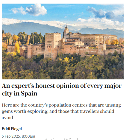 «La opinión sincera de un experto sobre cada ciudad importante de España», reza un titular de la sección turística de The Telegraph del pasado 5 de febrero. La experta es la periodista Eddi Fiegel y va un paso más allá al anunciar: «Estos son los centros de población del país que son joyas desconocidas (…) y aquellos que los viajeros deberían evitar«.