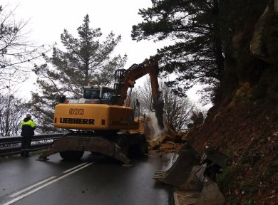 Ya trabajan en el lugar las máquinas para lograr retirar de la vía o romper la gran roca que ha caído esta mañana fruto de las precipitaciones sobre la GI3440, la carretera que une Lezo con Hondarribia por Jaizkibel, y que permanece cortada. No ha habido daños personales que lamentar.