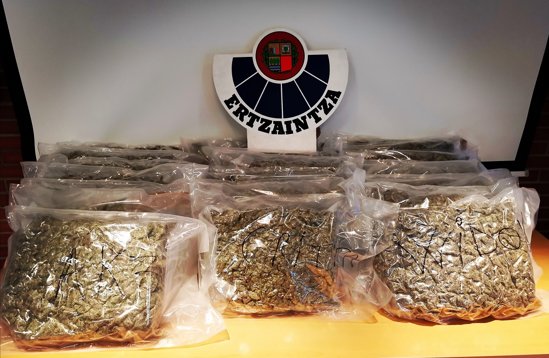 Agentes de la Ertzaintza detuvieron la madrugada del pasado jueves en Oiartzun a tres varones de 22, 28 y 30 años acusados de un delito de tráfico de sustancias estupefacientes. Los arrestados circulaban en dos vehículos cuando fueron sorprendidos merodeando por un polígono industrial. Uno de los presuntos narcotraficantes se dio a la fuga en un primer momento tras abandonar su vehículo cargado con la droga durante la persecución. En el interior del maletero se hallaron 22 bolsas de marihuana que al parecer tenían que transportar a Francia.