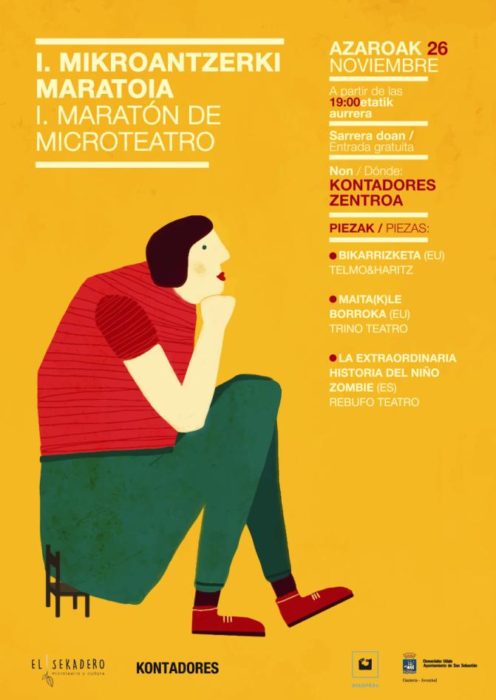 El Sekadero y el centro joven Kontadores organizan el I Maratón de Microteatro. Para poder prepararlo se realizó una convocatoria abierta para presentar piezas durante el 6 y 28 de octubre. En total se presentaron 16 piezas de microteatro y participaron 29 personas en la convocatoria. Entre las tres obras seleccionadas, dos se representarán en euskara y una en castellano. El jurado ha destacado la diversidad y el valor escénico de las piezas seleccionadas, así como el tratamiento original y actual de los temas que se tratan. El encuentro se realizará el 26 de noviembre, sábado, a las 19 en el Centro Kontadores. Los asistentes podrán ver: La obra ‘Bikarrizketa’ (del grupo Telmo & Haritz), en euskara; la obra ‘Maita (k)le borroka’ (de Trino Teatro), en euskara, y la obra ‘La extraordinaria historia del niño zombie’, de Rebufo Teatro, en castellano.