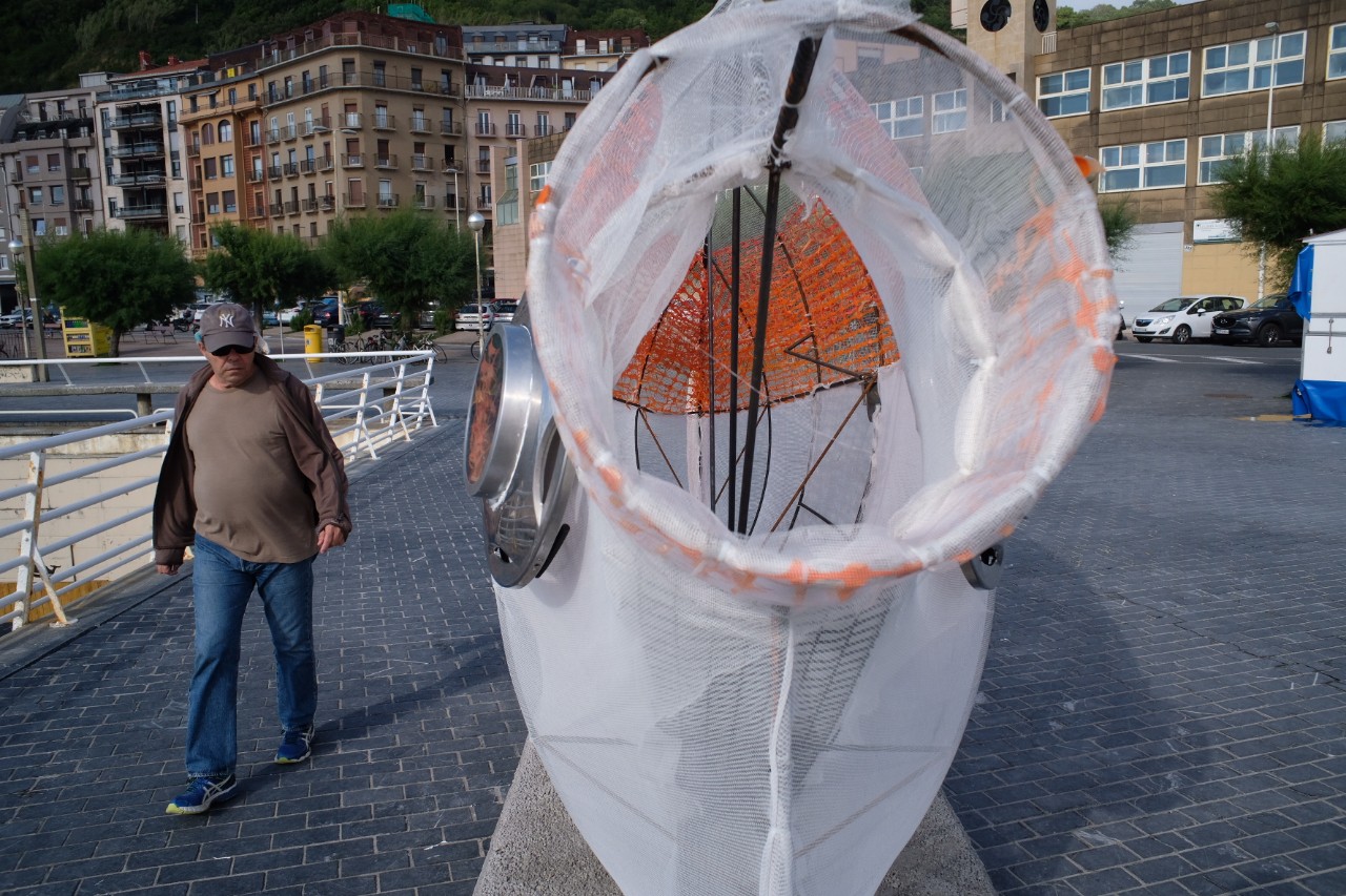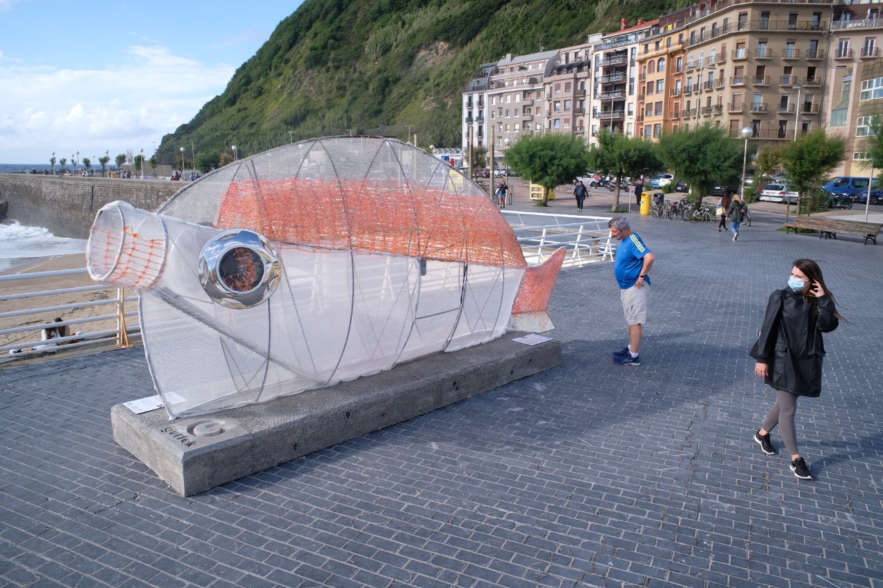 Ya está ubicado en el Paseo de la Zurriola el hermoso besugo que devorará el plástico de donostiarras y foráneos que circulen por este punto o por lo menos ésa es la pretensión de esta iniciativa de la campaña San Sebastián Zero Plastik que la concejalía de Ecología ha desarrollado en colaboración, en este caso en particular, con la Fundación Emaús. El llamativo besugo, de nombre Sebastián, es obra del arquitecto Iñaki Arbelaitz y está elaborado con material reciclado.