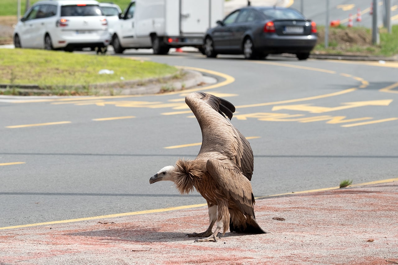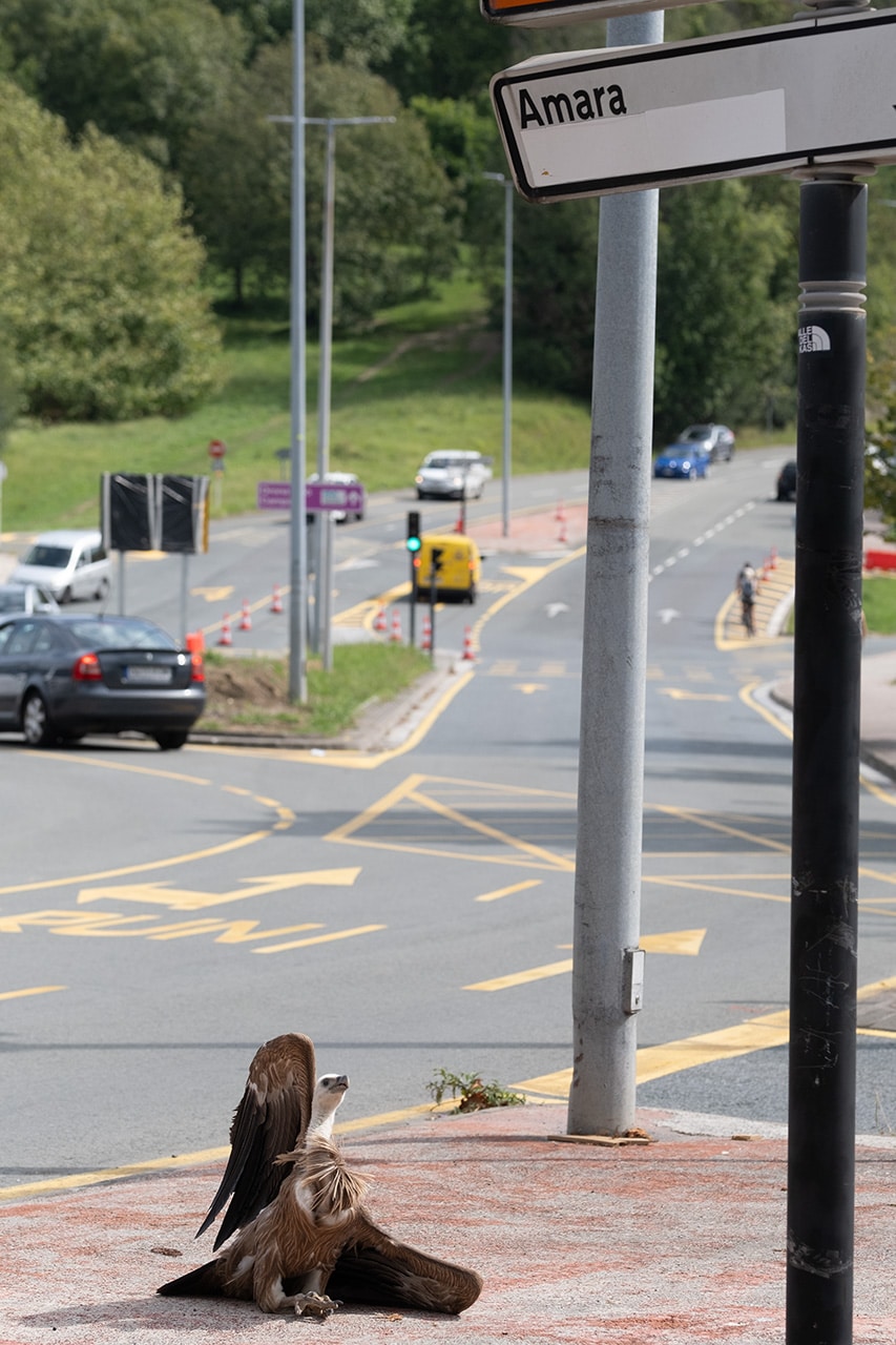 Un buitre leonado tranquilo pero herido en una pata, ha aparecido esta mañana cerca del mediodía en la rotonda de Anoeta de San Sebastián para sorpresa de los viandantes, que en muchos casos se han quedado para observar qué ocurría. Finalmente se lo ha llevado la Guardia municipal metido en un coche. En el asiento del copiloto.