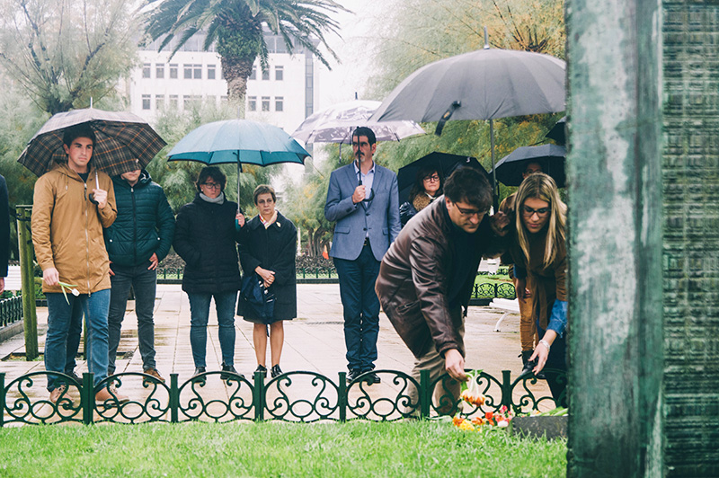 En Donostia el Día de la Memoria se ha ilustrado hoy en los jardines de Alderdi Eder, bajo la lluvia, junto al monolito y con una ofrenda floral que sí ha contado con la presencia de todos los partidos políticos con representación municipal. «Que seamos capaces de unirnos en lo mínimo, en la dignidad humana», ha expresado al respecto el alcalde Eneko Goia, quien agradeció a todos los grupos la ausencia de discrepancias. No ha sido así en otros territorios. De hecho en el acto central del Parlamento vasco han participado todos los grupos políticos excepto el PP. Allí la presidenta de la Cámara vasca, Bakartxo Tejería, que ha presidido el homenaje, ha hecho un llamamiento a “no olvidar el pasado y las dramáticas consecuencias padecidas”.