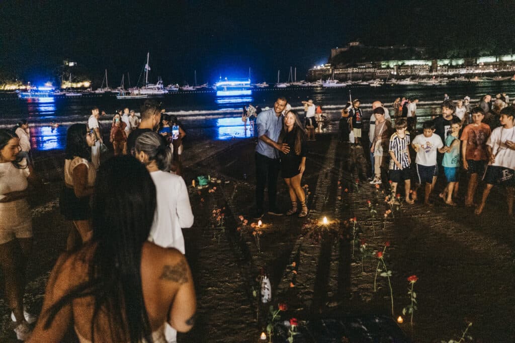 Más de un curioso preguntó si se trataba de una especie de altar profano, realmente tenía el tono, pero no. Se trataba del atrezzo con el que los amigos de los colombianos residentes en Irun, David y Karol, quisieron acompañar la declaración de amor que él le tenía preparada a su novia, y que transcurrió en la playa de la Concha en pleno espectáculo de música y fuegos artificiales el sábado por la noche. Los amigos, en fin, habían acudido antes de la cita para ponerlo todo bonito y estaban ansiosos cuando vieron que el espectáculo estaba por comenzar y los miembros de la pareja no aparecían. Finalmente llegaron y, con ese escenario, ya estaba parte del trabajo hecho. Karol se mostró encantada y salió todo conforme a lo esperado.