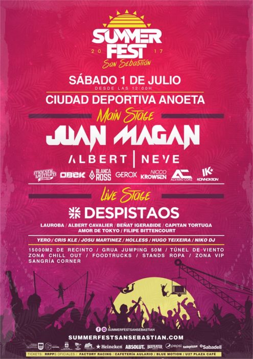 Con Juan Magán como cabeza de cartel, el DJ Albert Neve, Despistaos, Laura y Albert Cavalier, entre una treintena de artistas, la música en Anoeta está mañana asegurada de la mano del Summer Fest San Sebastian en una jornada intensa que comenzará al mediodía y que pretende aunar, además de música, experiencias (jumping, túnel de viento, exposiciones) e incluso descanso en la zona chill out y gastronomía con las food trucks.