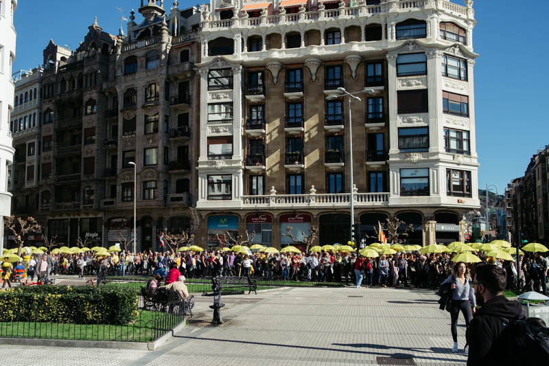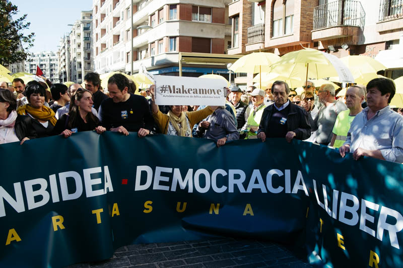 Muy nutrida ha sido la manifestación de Gure Esku Dago en apoyo «de la democracia y de la libertad» en Cataluña y que ha contado con representantes de partidos nacionalistas, sindicatos vascos y asociaciones. Las banderas catalanas y muchos, muchos paraguas amarillos (sombrillas sería más adecuado en un día como el de hoy) han coloreado las calles donostiarras con lemas reiterados a favor de la libertad para los presos a quienes se juzga estos días en el Supremo. «Es momento de actuar como pueblo», han expresado los organizadores.