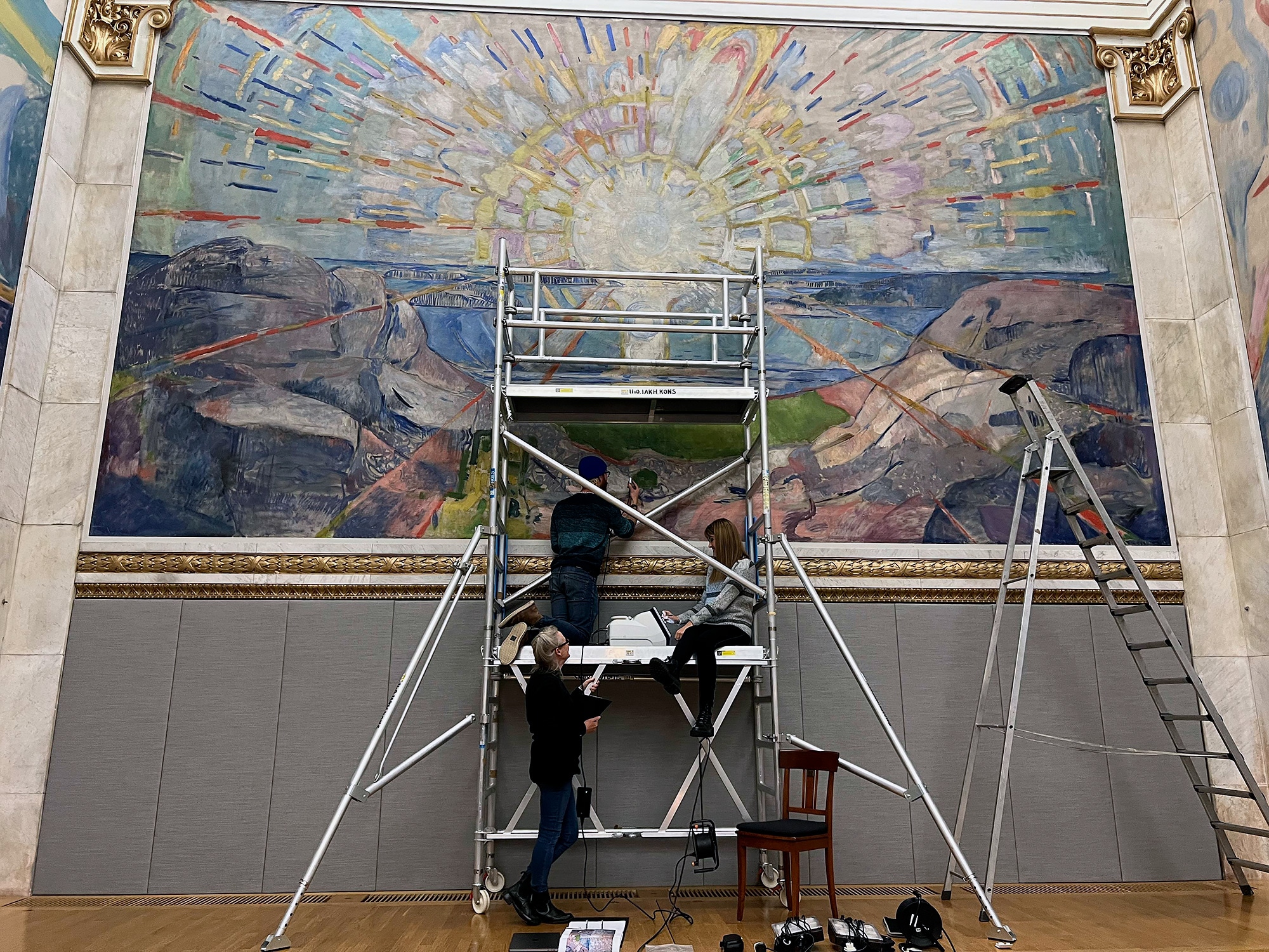 El proyecto de análisis y conservación de las pinturas monumentales del Aula Magna, llamado ‘Munch Aula Painting Project’, comenzó en 2005, con el objetivo de averiguar la técnica pictórica de Edvard Munch, considerada de gran complejidad. En 2009 se llevó a cabo la primera restauración de los cuadros, que fueron retirados del espacio hasta que en 2011 fueron recolocados. Las mediciones han arrojado la acumulación de material particulado que desde 2011 ha vuelto a aparecer en las obras pictóricas.