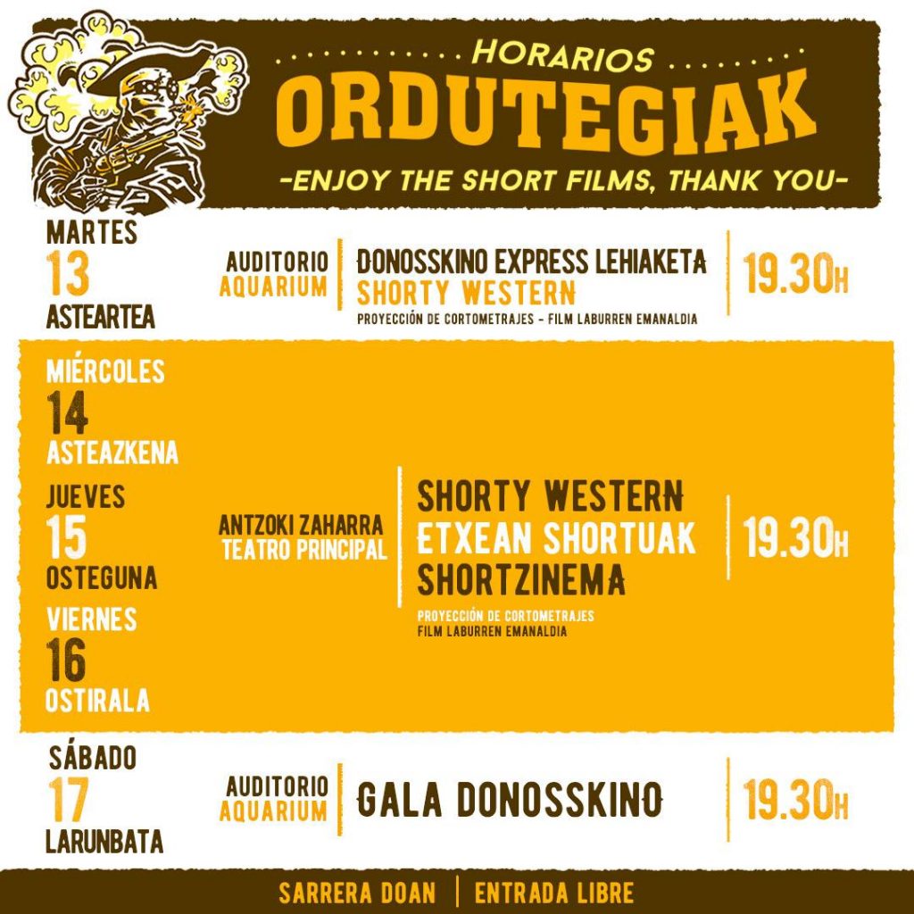 Donosskino Vol.IV está formado por tres secciones: ShortZinema (días 14 a 16), Etxean Shortuak (ídem) y Shorty Western (13 a 16). Entre todas ellas aglutinan más de una treintena de cortometrajes que se proyectarán siempre a partir de las 19.30 horas.