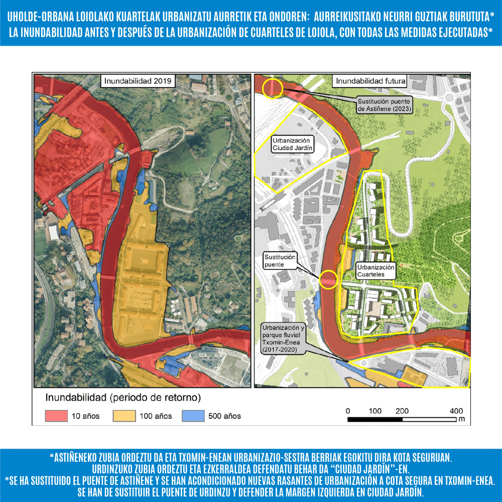 Tapia ha defendido que “el nuevo desarrollo urbanístico e hidráulico deben ir de la mano, es momento de que el rio Urumea pase de ser un problema una oportunidad. Nuestras ciudades han crecido sin integrar de forma correcta el medio hidráulico, hemos pasado muchos años dando la espalda al rio, ahora es momento de volver a mirarlo de frente y entenderlo como un nuevo espacio de oportunidad; más si cabe en Loiola, donde la configuración actual de los cuarteles no nos ha posibilitado mejorar la mancha de inundabilidad”.