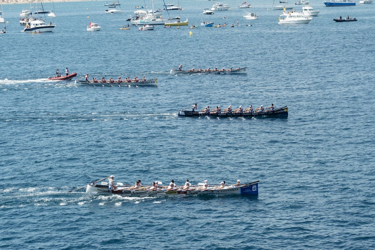 La prueba empezó con emoción y retraso por anularse la primera salida y tener que volver los botes al punto de partida. Orio y Kaiku dominaron de inicio la primera tanda hasta que Hondarribia pasó a comandar la carrera y a meter palada a palada segundos a todos sus rivales.