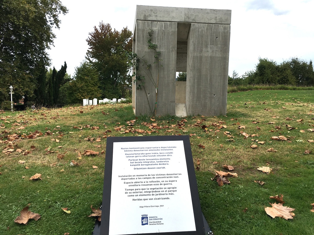 Fruto de aquella declaración se acordó levantar una obra que recordase la memoria de las víctimas. Se ha colocado ya en los jardines del parque de Aiete. La Concejala de Igualdad y Derechos Civiles, la socialista Ane Oyarbide, ha explicado que “se trata de un espacio cúbico abierto de 2,5 metros de alto, fabricado en hormigón armado, que trata de evocar un búnker, uno de los muchos símbolos que nuestra memoria guarda de aquella dura guerra y de aquellos episodios.”