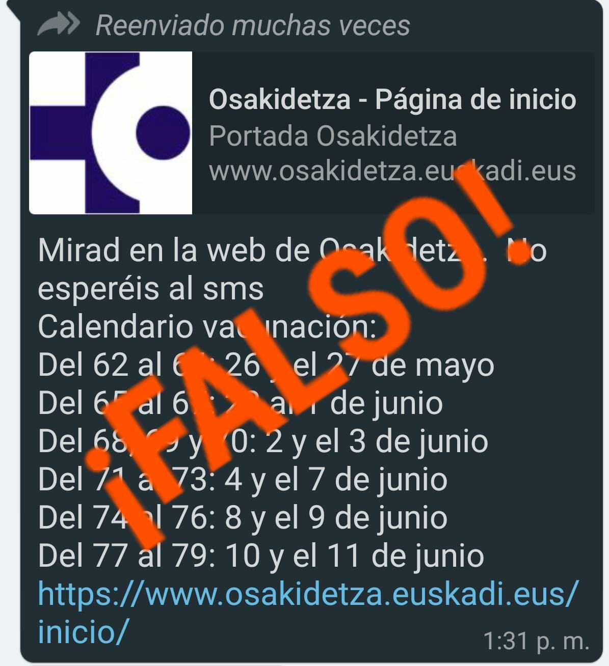 Un mensaje de whatsapp con contenido falso ha preocupado a Osakidetza que advierte de que hay que ignorar su contenido. En el falso mensaje se insta a no esperar a recibir un SMS para coger cita y vacunarse contra la Covid-19 en Euskadi. Osakidetza recuerda, sin embargo, que hay que esperar y que los ciudadanos serán contactados como hasta ahora.