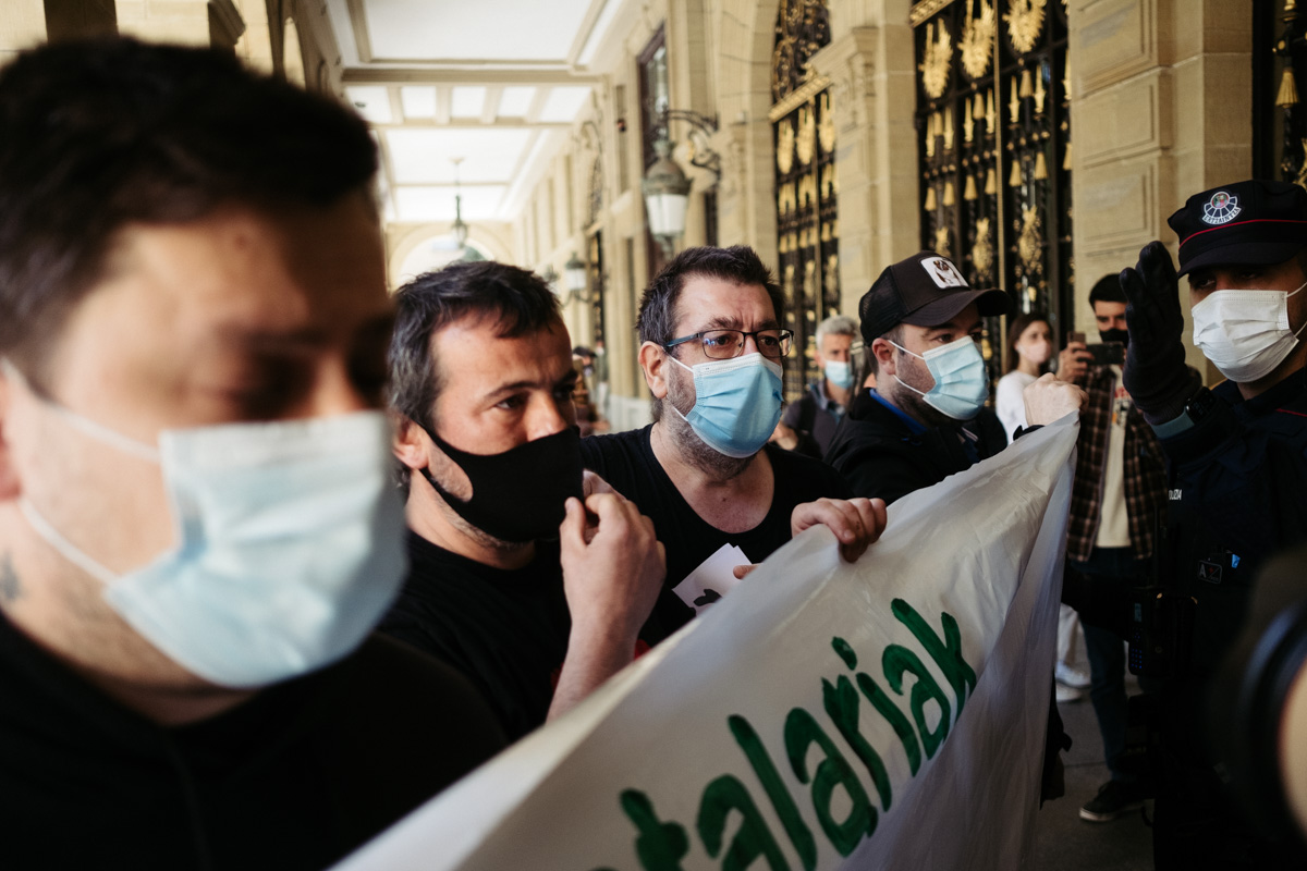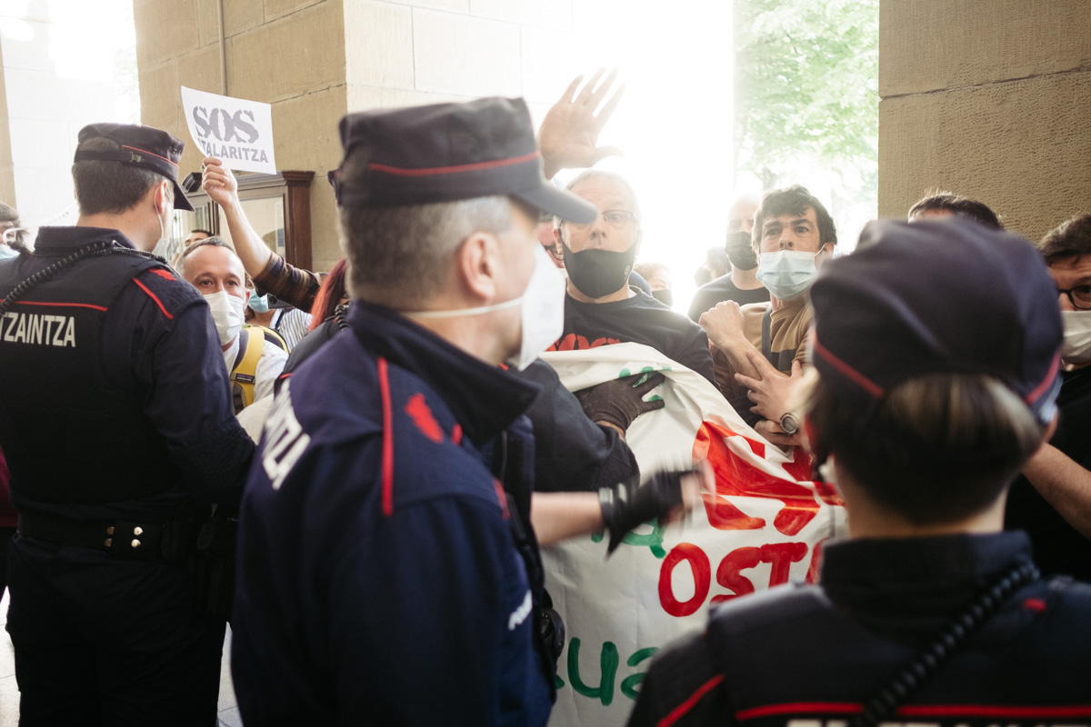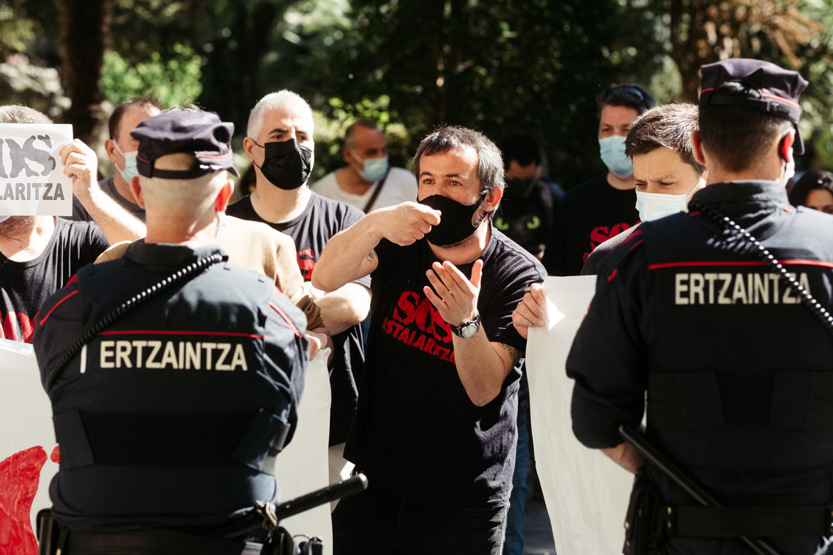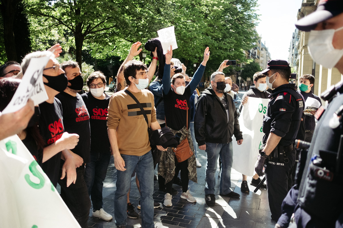 SOS Ostalaritza había convocado una protesta a las 11.30 horas con el consiguiente encadenamiento de varios de sus miembros. Las protestas anteriores, también en petición de ayudas a un sector muy golpeado por la pandemia, no habían generado enfrentamientos de esta dimensiones.