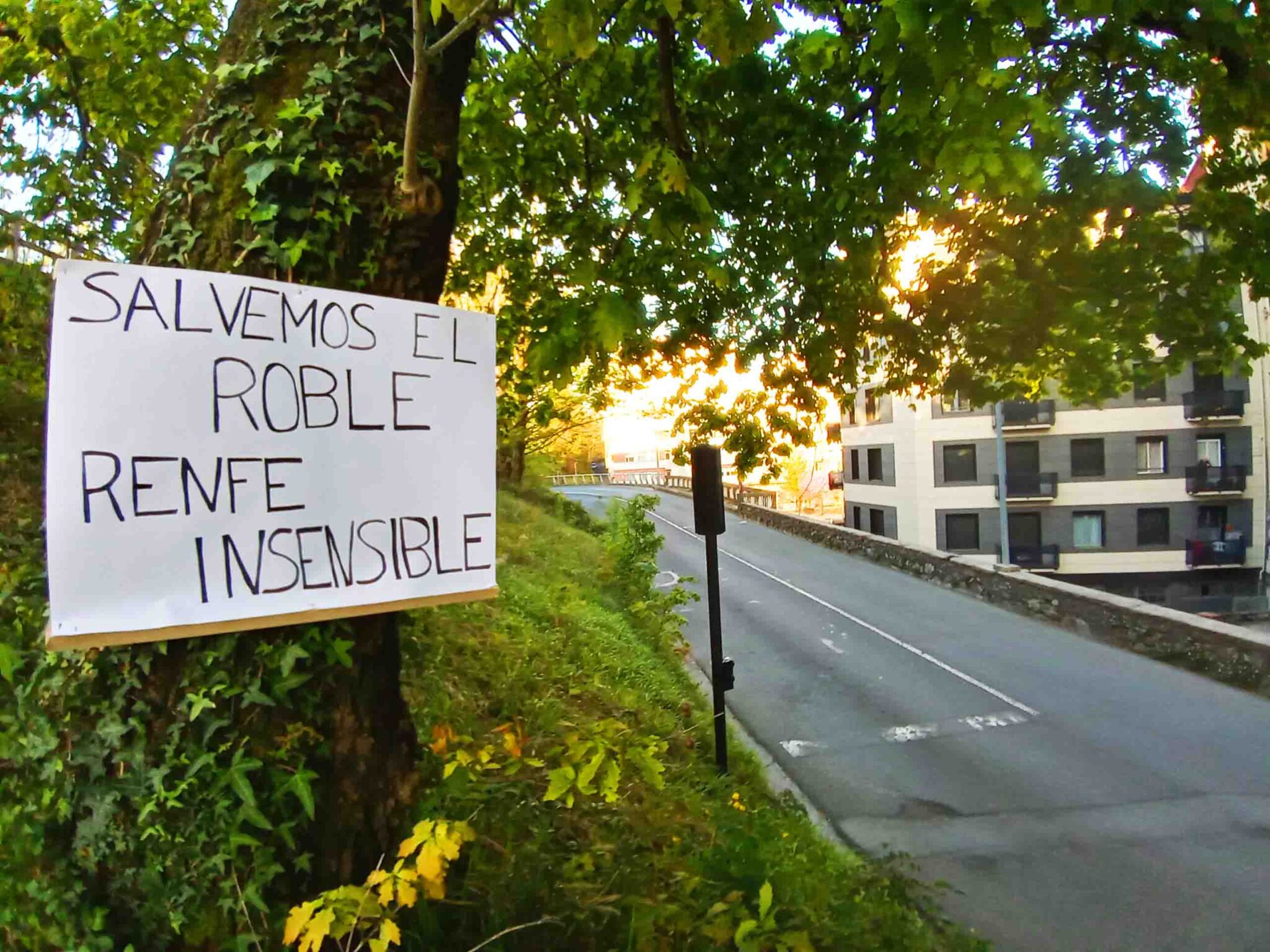 Algunos vecinos han colocado en el tronco del roble un cartel en protesta por «la agresión ambiental«.